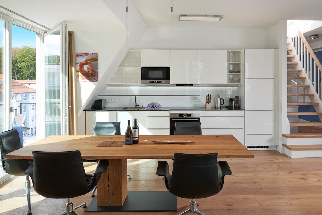Exklusivität wird großgeschrieben! Auf der zum "Meerselig" gehörenden rd. 88 m² großen Dachterrasse über der Wohnung ergibt sich ein seitlicher Blick auf die Ostsee bis hin zum Selliner See und auf eine wunderbare Gartenanlage vor dem FIRST. Ein Richtung Osten ausgerichteter großer Balkon lädt zum Frühstücken ein. Ein weiterer Südbalkon bietet einen phantastischen Blick auf die Insel Rügen, den Selliner See und den Ort. Über eine Treppe erreicht man ganz einfach das Hallenbad mit Ostseeblick und die Saunen. Der Wohn-/Essbereich (ca. 36 m²) ist mit einer hochwertigen Küche mit Natursteinarbeitsplatte und Bosch-Geräten (Backofen, Mikrowelle, Geschirrspüler, Kühlschrank, Induktionskochfeld) ausgestattet. Im Wohn-/Essbereich erwartet Sie eine ausgesuchte, hochwertige Möblierung u. a. von Cassina, Knoll und B&B italia. "Meerselig" verfügt über zwei Schlafzimmer (ca. 15 m² inkl. Bad/Dusche und ca. 22 m² inkl. En-Suite-Bad/Wannenbad). Die Schlafzimmer sind mit Boxspringbetten (180 cm x 210 cm) von Schramm sowie Kleiderschränken von Poliform ausgestattet. In den Bädern finden Sie hochwertige Dornbracht-Armaturen und elegante Badobjekte von Villeroy & Boch. Darüber hinaus gibt es ein Gäste-WC. Die gesamte Wohnung verfügt über Fußbodenheizung unter einem Eichenholzfußboden. Hinweis auf Bautätigkeit in der Nähe: Das "Kurhaus" auf der dem FIRST gegenüberliegenden Seite der Wilhelmstraße wurde in den letzten Monaten abgerissen. Zurzeit beginnen die Neubauarbeiten, die sich - je nach Art der aktuellen Arbeiten - mehr oder minder stark beeinträchtigend auf die Nachbarschaft auswirken könnten. Nach Informationen der Gemeinde sind Bauarbeiten werktags zwischen 07.00 Uhr und 18.00 Uhr zulässig. Wir haben deshalb bei der diesjährigen Preisgestaltung einen entsprechenden "Baustellenrabatt" bereits berücksichtigt. Dies gilt für alle vier unserer Penthouse-Wohnungen, auch wenn sie aufgrund ihrer jeweiligen Lage unterschiedlich betroffen sein dürften. Über den Fortgang bzw. den Ablauf der Bauarbeiten haben wir leider keine Kenntnis und natürlich können wir auch keinen Einfluss darauf nehmen.