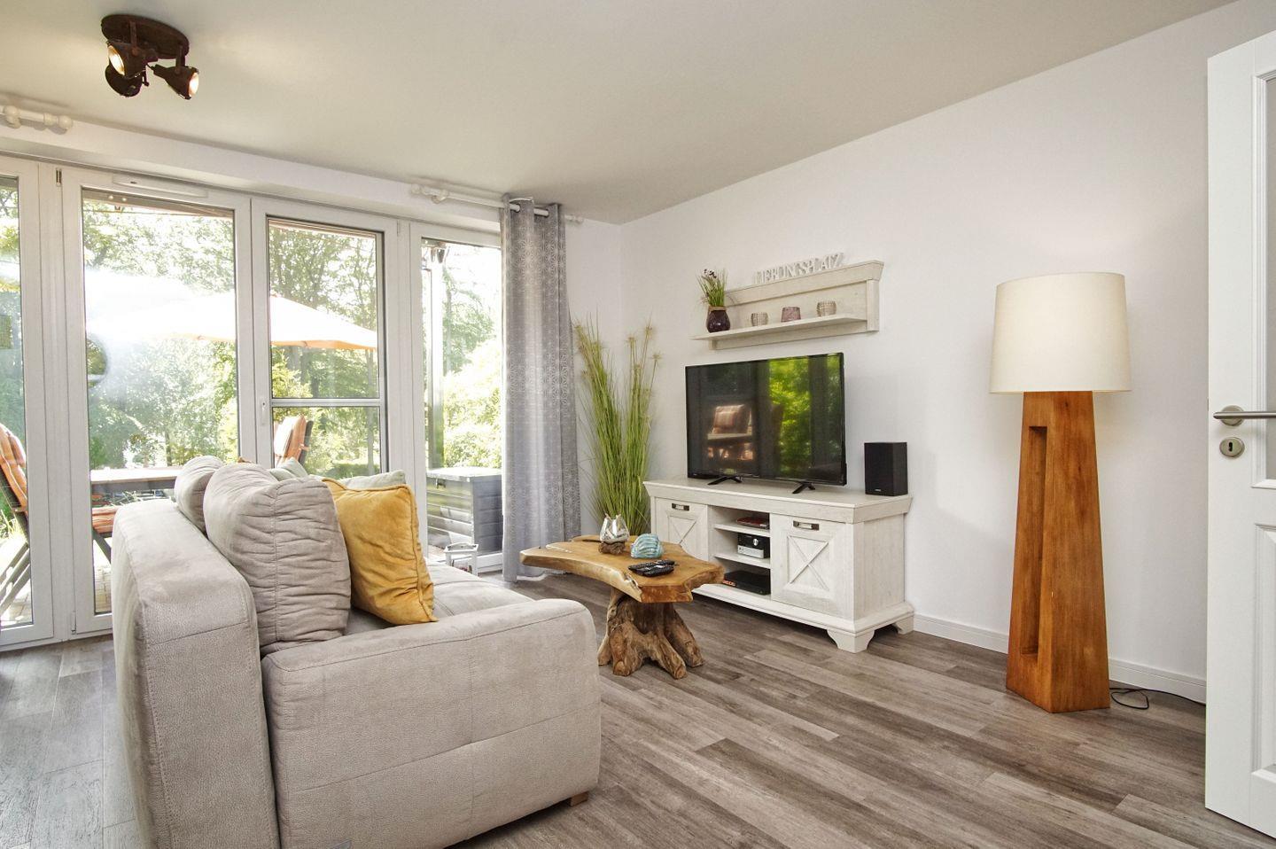 WOHNEN // Wohnraum mit Essbereich, Sitzgarnitur mit bequemer Couch, Sessel, Smart-TV, DVD-Player, Terrasse ++