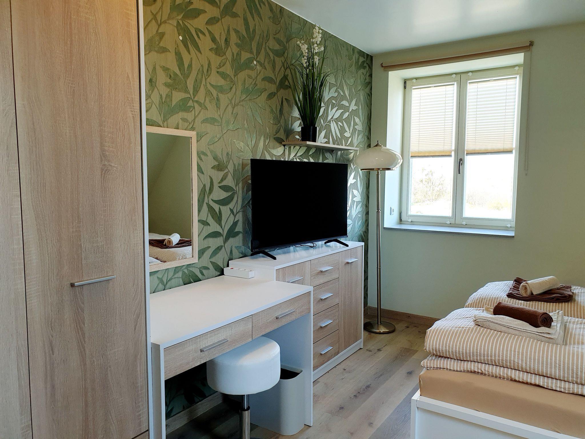 • Im Aussenbereich finden die Gäste einen Spielplatz, Sitzmöglichenkeiten zum Erholen und Entspannen und Fahrradunterstellmöglichkeiten, eine Gemeinschaftsküche, ein Aufenthaltsraum sowie eine barrierefreie Dusche und WC sind vorhanden. Im Hauptgebäude befinden sich sechs Zimmer. Die Zimmer haben einen direkten Zugang über eine Treppe im Innenbereich des Gebäudes. Jedes Zimmer hat ein eigenes Bad mit DU/WC, direkt gegenüberliegend. Im Objekt gibt es eine Gemeinschaftssauna (buchbar vor Ort gegen Aufpreis). Bei Zimmer sieben ist das Bad über eine Außentreppe erreichbar.