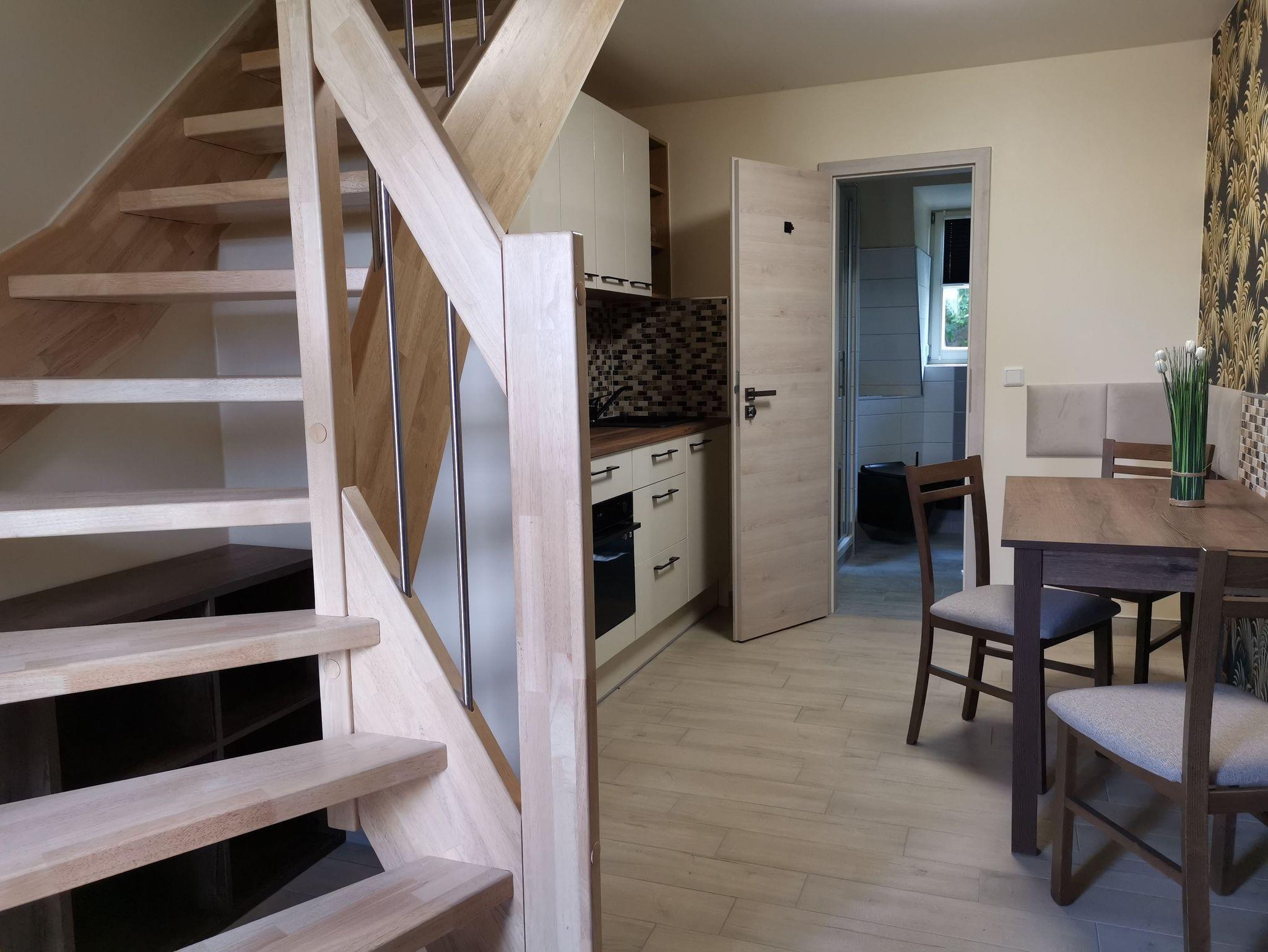 Zum Appartment gelangt man über eine Außentreppe oder bequem mit dem Aufzug. Im Appartment kommt man über eine Treppe zur den oberen Räumlichkeit.