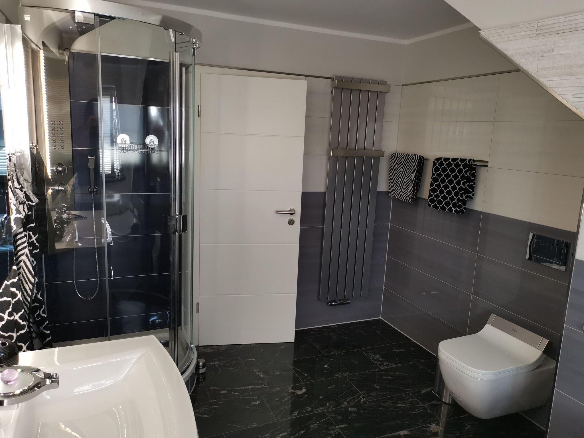Entspannen Sie im großen Bad und nutzen Sie den gemütlichen Whirlpool samt besonderem Farbspiel und zahlreichen Massagedüsen. Ist Ihnen nebenbei nach ein wenig leichter Unterhaltung, schalten Sie einfach den im Spiegel integrierten Fernseher an und entspannen bei Ihrer Lieblingsserie. Ein tolles Erlebnis bietet unsere Komfortdusche mit einem Farbspiel der besonderen Art. Verschiedene Einstellungen der Düsen lassen Sie noch besser abschalten. Aber auch das WC mit integriertem Bidet sowie eine kleine Auswahl an Hygieneprodukten sorgen für kleine Wellnessmomente. Lassen Sie sich ruhig Zeit und gönnen Sie sich ein paar Minuten mehr. Denn müssen die anderen Gäste auf Toilette, nutzen Sie einfach das Gäste-WC im Erdgeschoss. Handtücher und Fön können Sie übrigens getrost Zuhause lassen, damit in Ihrem Koffer mehr Platz für ein weiteres Urlaubsoutfit bleibt.