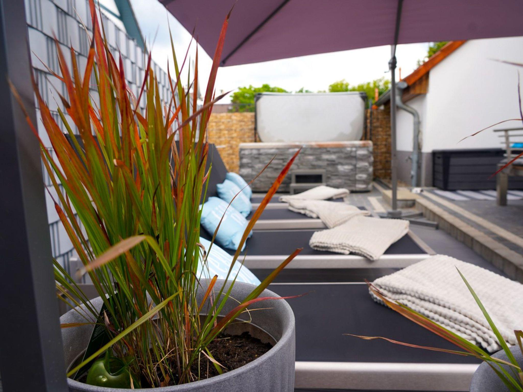 • 1 Terrasse mit Sitzmöglichkeiten mit Grillkamin & beheizbaren Whirlpool