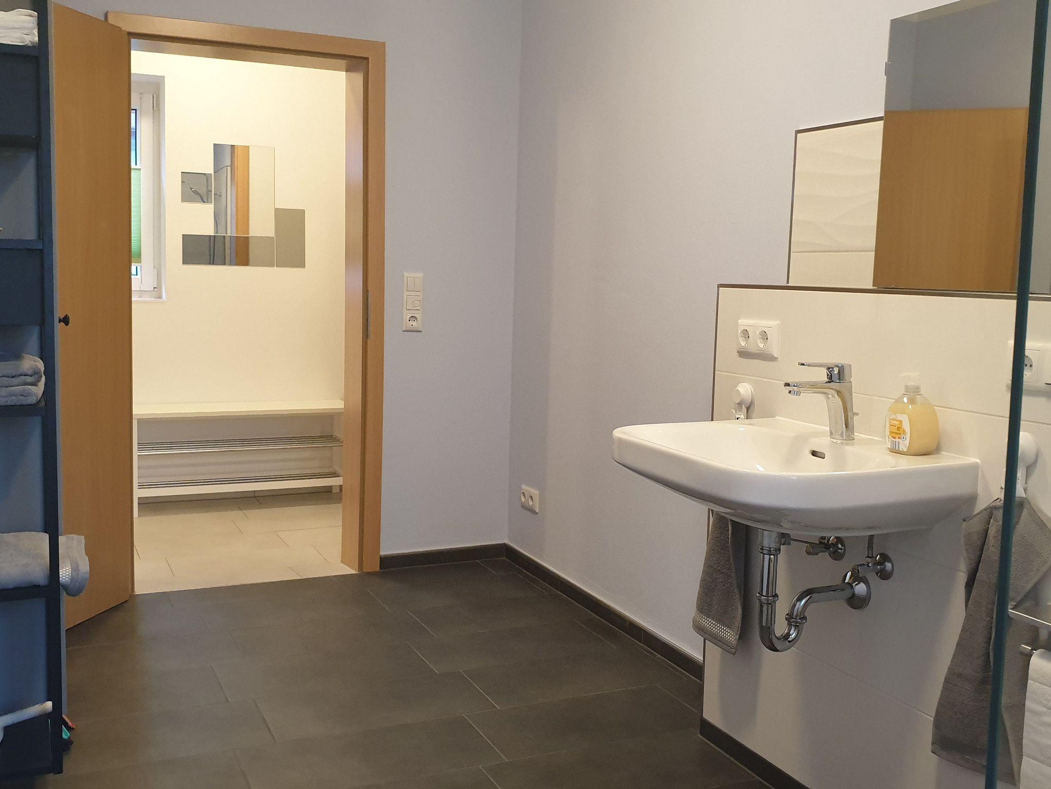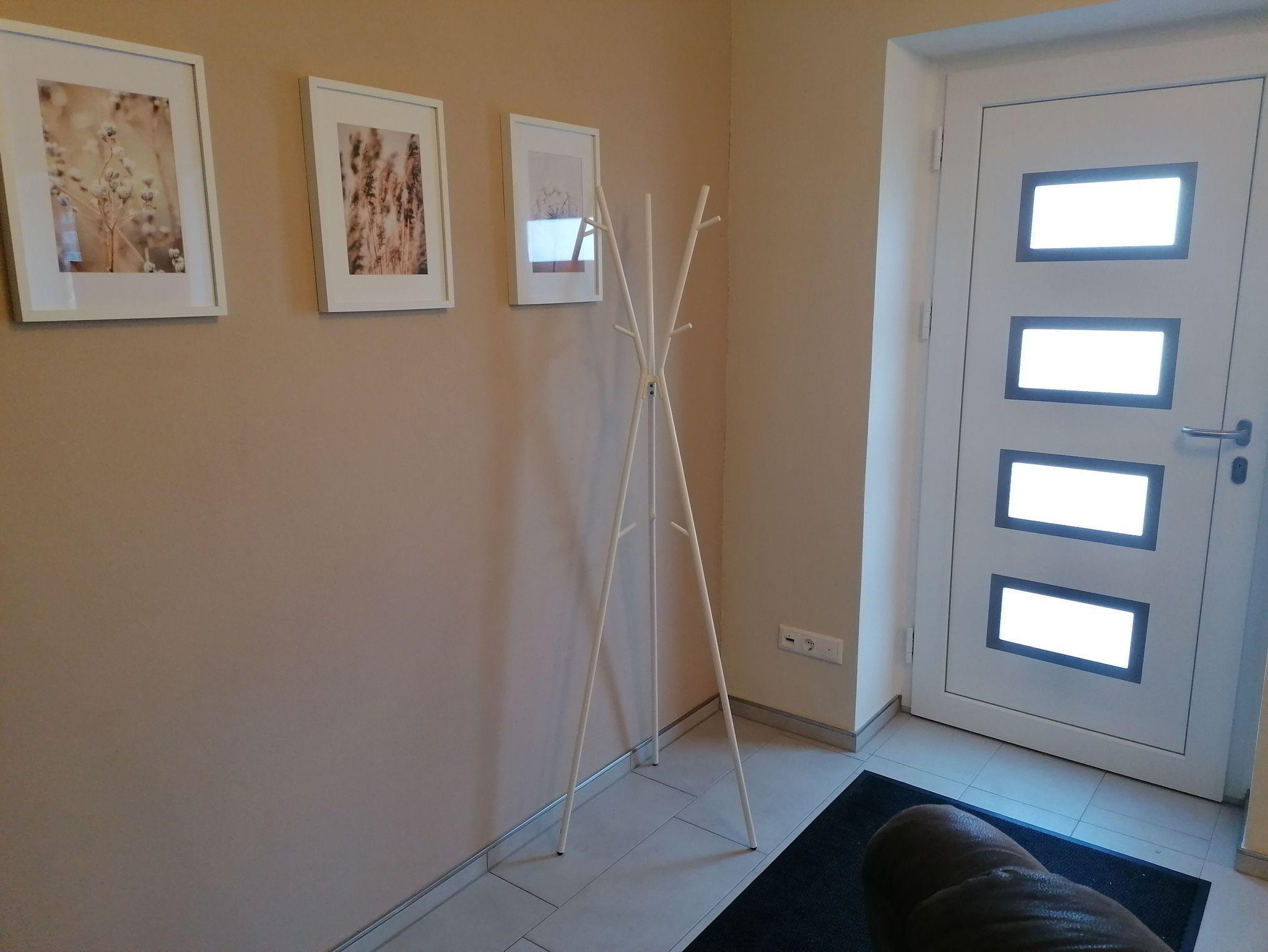 Die Ferienwohnung ist ebenerdig gelegen und hat einen Wohnraum mit TV, einer kleinen offenen Küche mit Kühlschrank, einer Kochmöglichkeit und einer Sitzmöglichkeit zum Essen, einer Schlafcouch (bei Aufbettung), ein separates Schlafzimmer mit einem Doppelbett (160x200), einem kleinen Flur und einem großen Bad mit DU/WC.