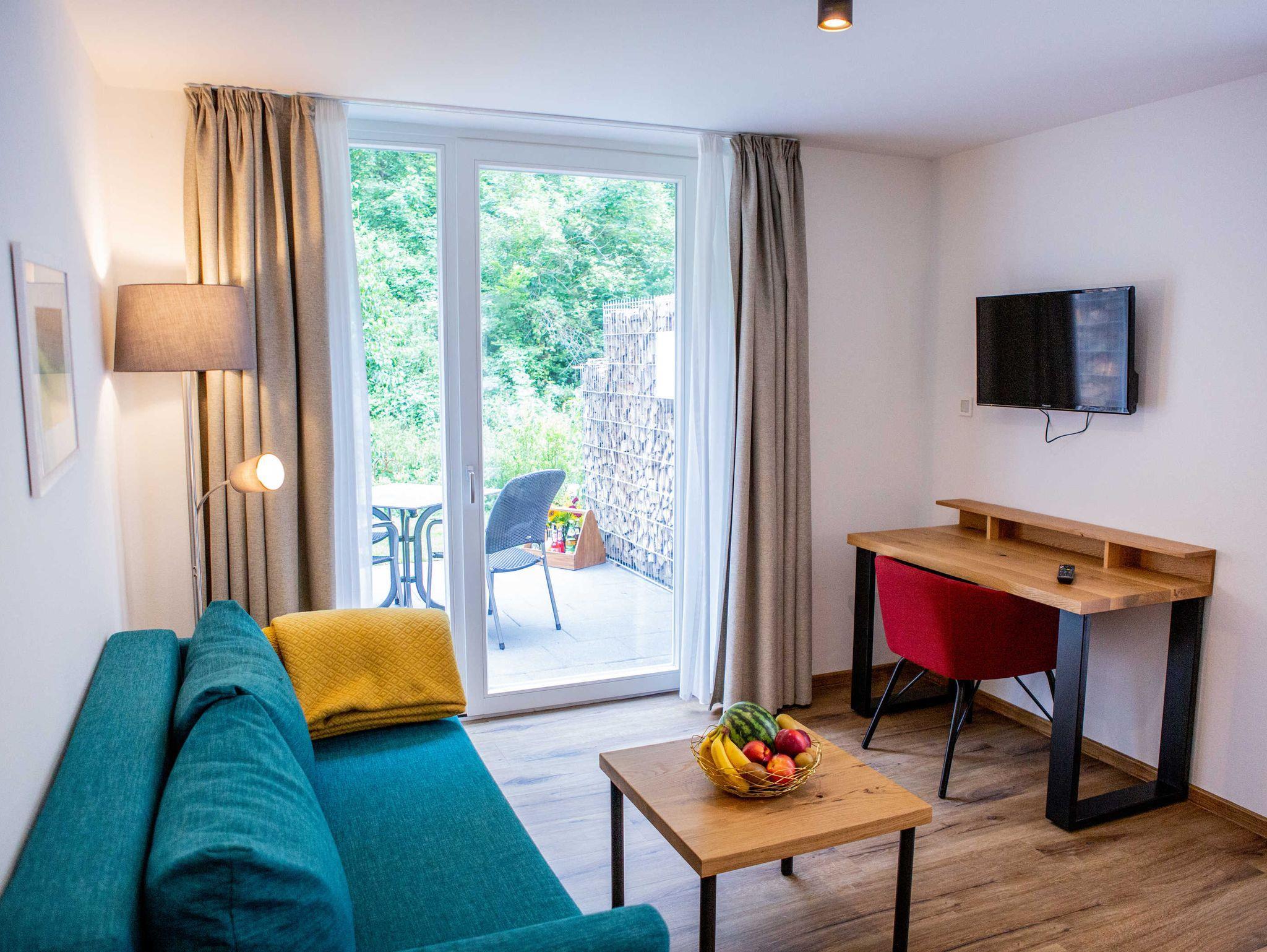 Die Ferienwohnung Akazie verfügt über einen separaten Eingang. Das Schlafzimmer liegt separat im vorderen Teil der Wohnung und man hat eine Terrasse mit wunderschönem Blick auf den Bach und Wald.