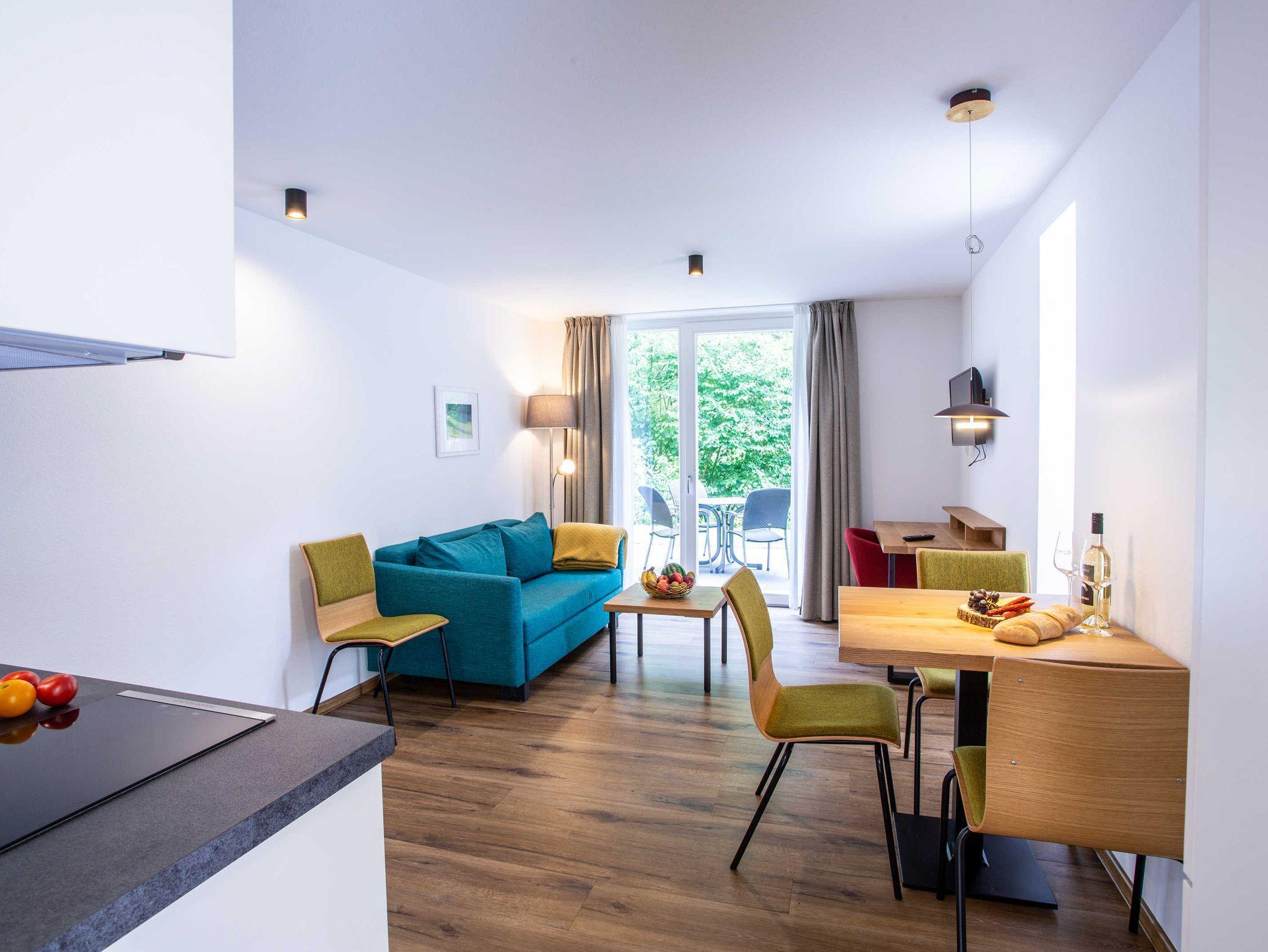 Unsere Zwei-Zimmer-Ferienwohnungen von 36 bis 39 m² sind Nichtraucherwohnungen, aber Tiere sind erlaubt. Sie verfügen über ein Schlafzimmer mit Doppelbett, ein Wohnzimmer mit Schlafsofa, eine Küchenzeile mit 2-Platten-Induktionsherd, einen Balkon oder eine Terrasse, Dusche/WC, SAT-TV-Flatscreen und W-LAN.