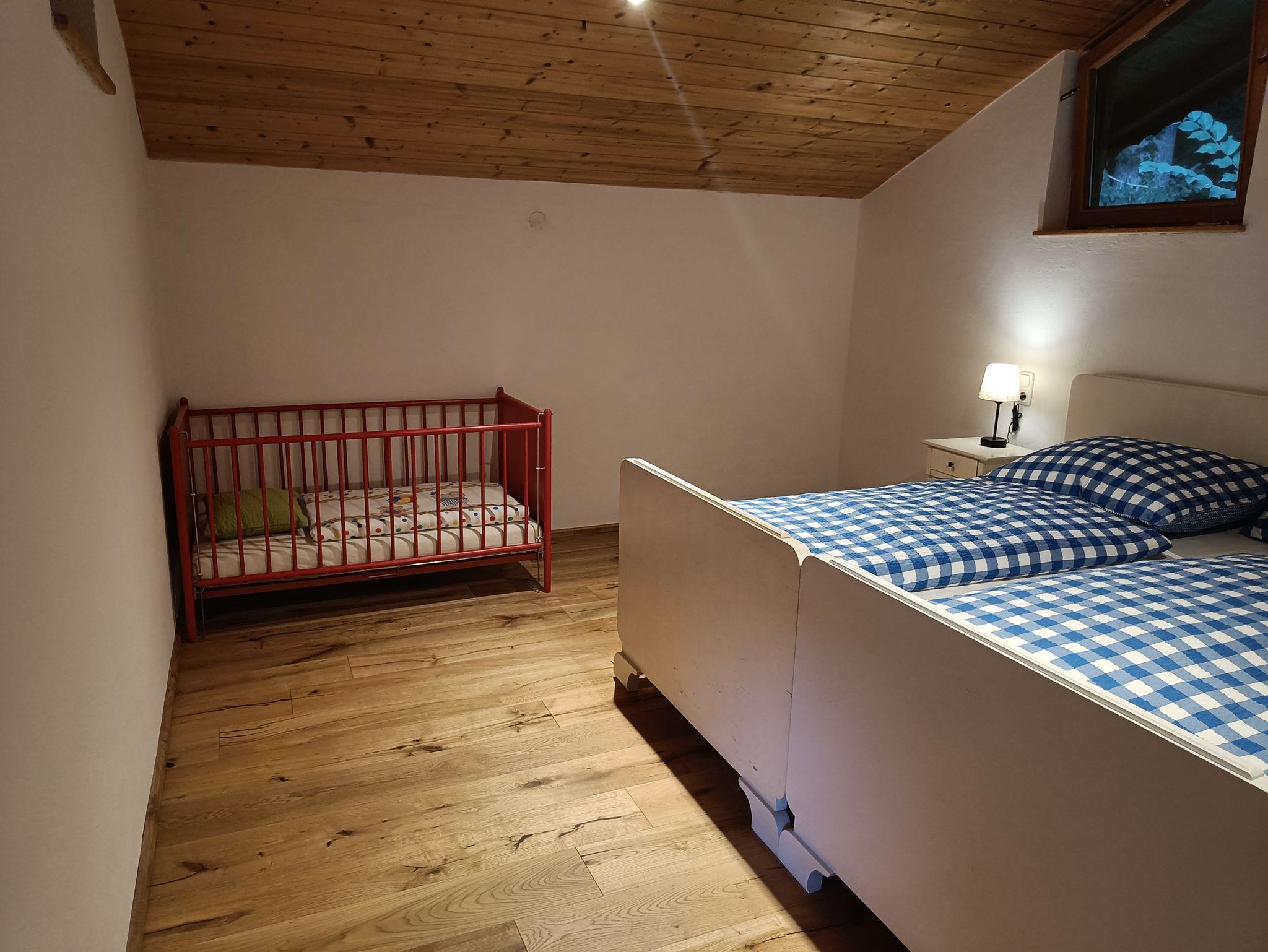 Über 4 Stufen erreichen Sie das gemütliche Schlafzimmer mit Doppelbett. Hier ist Platz für ein zusätzliches Kinderbett oder Gitterbett.