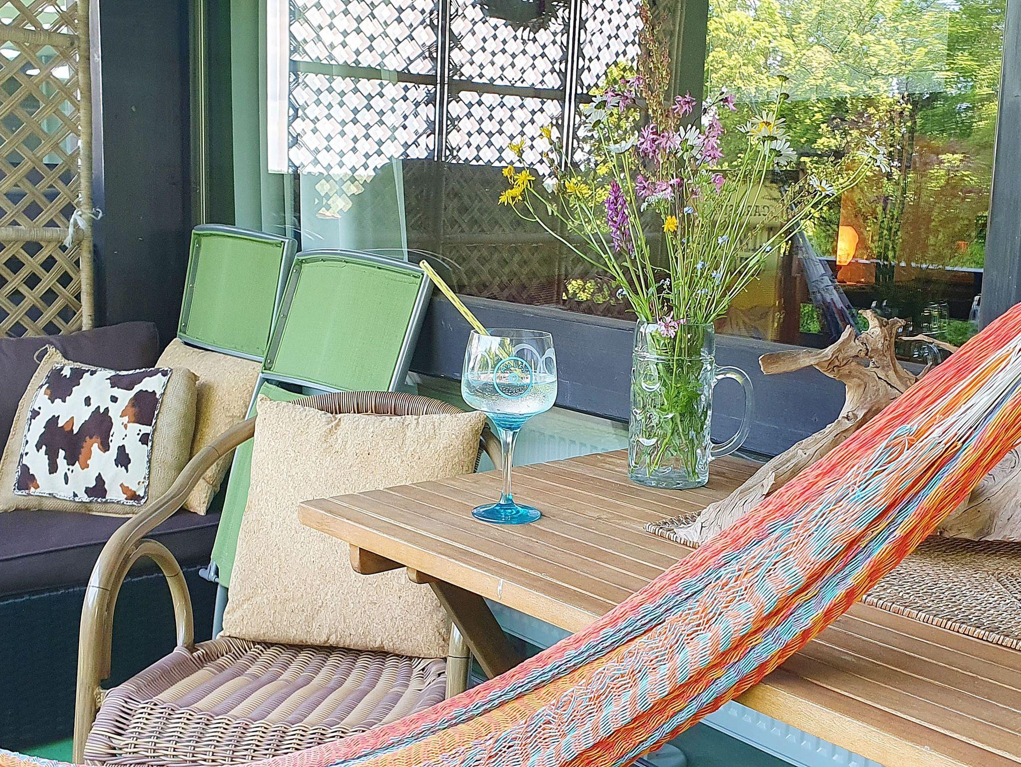 - Loggia mit Balkon- und Loungemöbeln sowie einer Hängematte