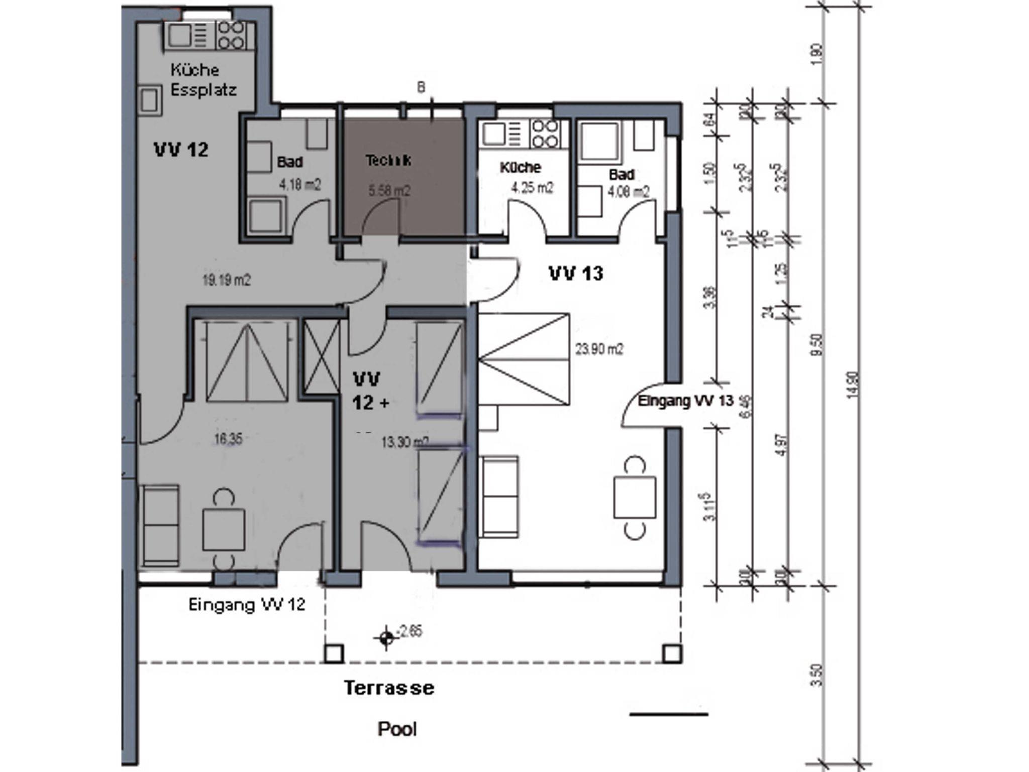 VV 13: EG, ca. 33 m², komb. Wohn-/Schlafzimmer, 2 Box-Spring-Betten und 1 Schlafcouch, Duschbad, separate Küche, große Terrasse direkt am Pool.