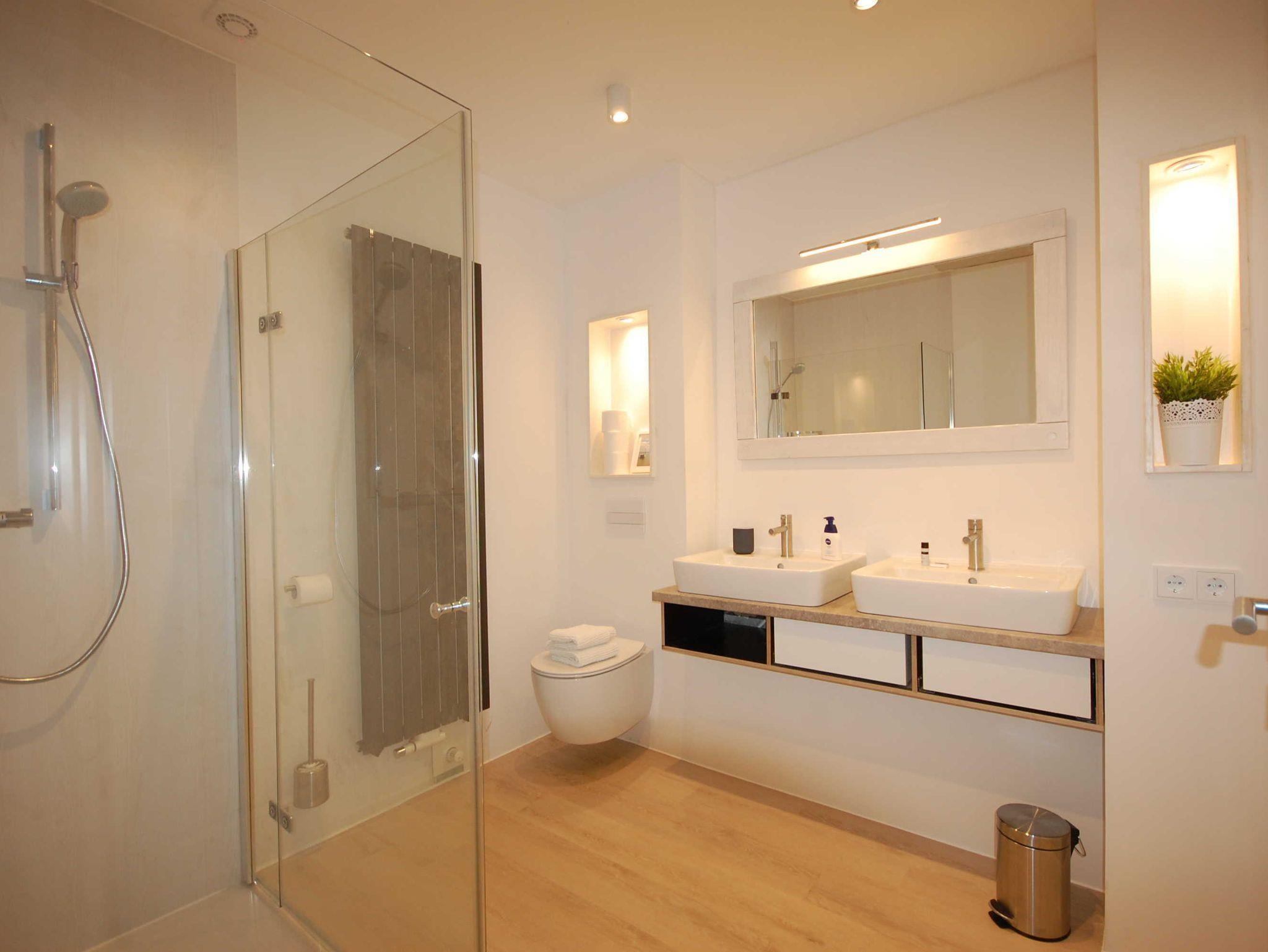 Im modernen Bad erwarten unsere Gäste eine Walk-In-Dusche, Fußbodenheizung, ein großer Handtuchheizkörper sowie ein Doppelwaschtisch aus Porzellan mit praktischem Unterschrank, Schubladen, Steckdose und Föhn.