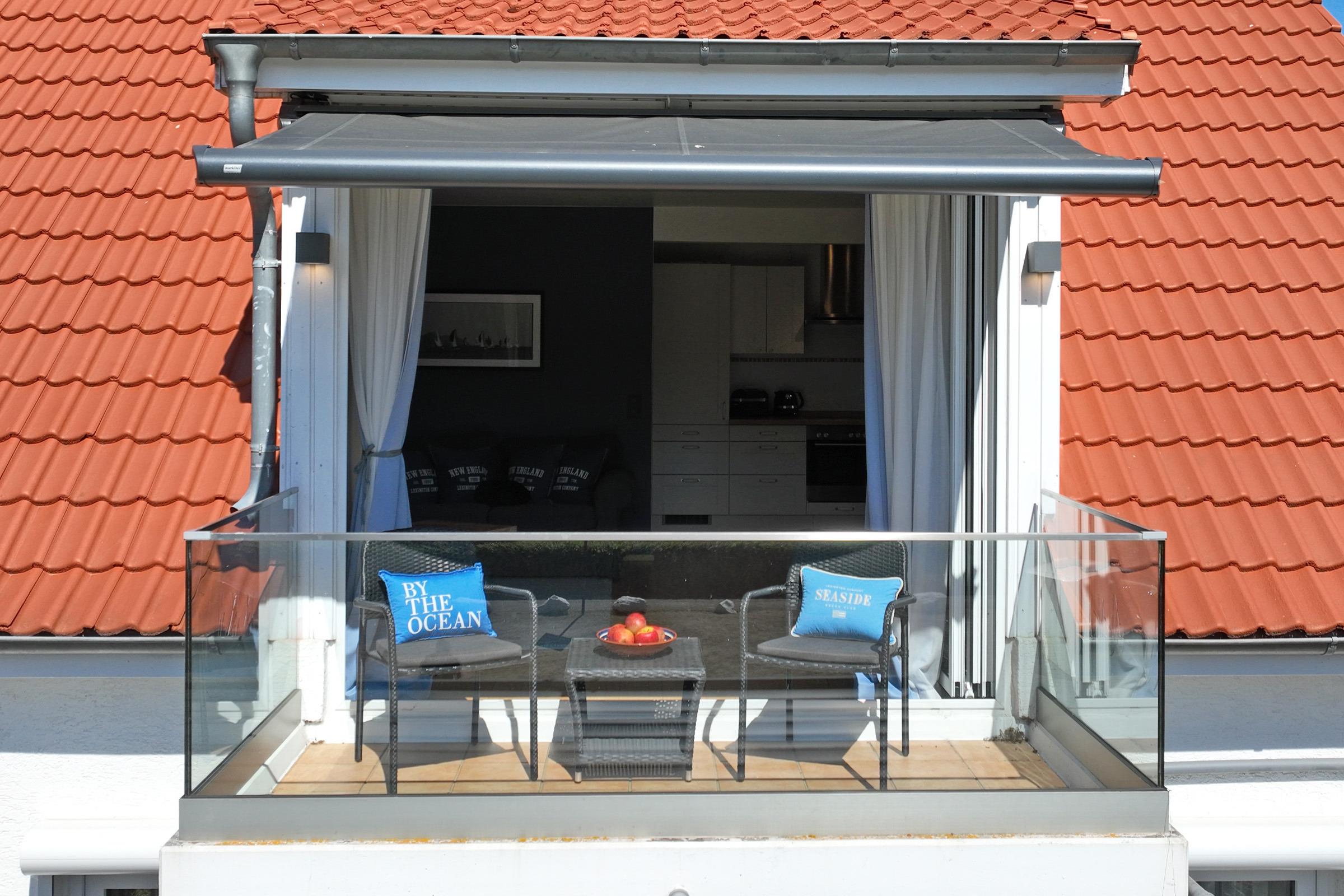 Der offene Wohnbereich ist stilvoll eingerichtet und lädt mit 2 gemütlichen Schlafsofas (180x200 cm) und TV zum Entspannen ein. Große Fenster sorgen für ein helles und freundliches Ambiente, von hier aus gelangen Sie auf den Balkon und können von hier aus schon einen Teil der Ostsee sehen. Direkt angrenzend befindet sich die überdachte Terrasse mit Gartenmöbeln und eigenem Strandkorb – perfekt für ein ausgedehntes Frühstück oder einen entspannten Abend an der frischen Meeresluft.