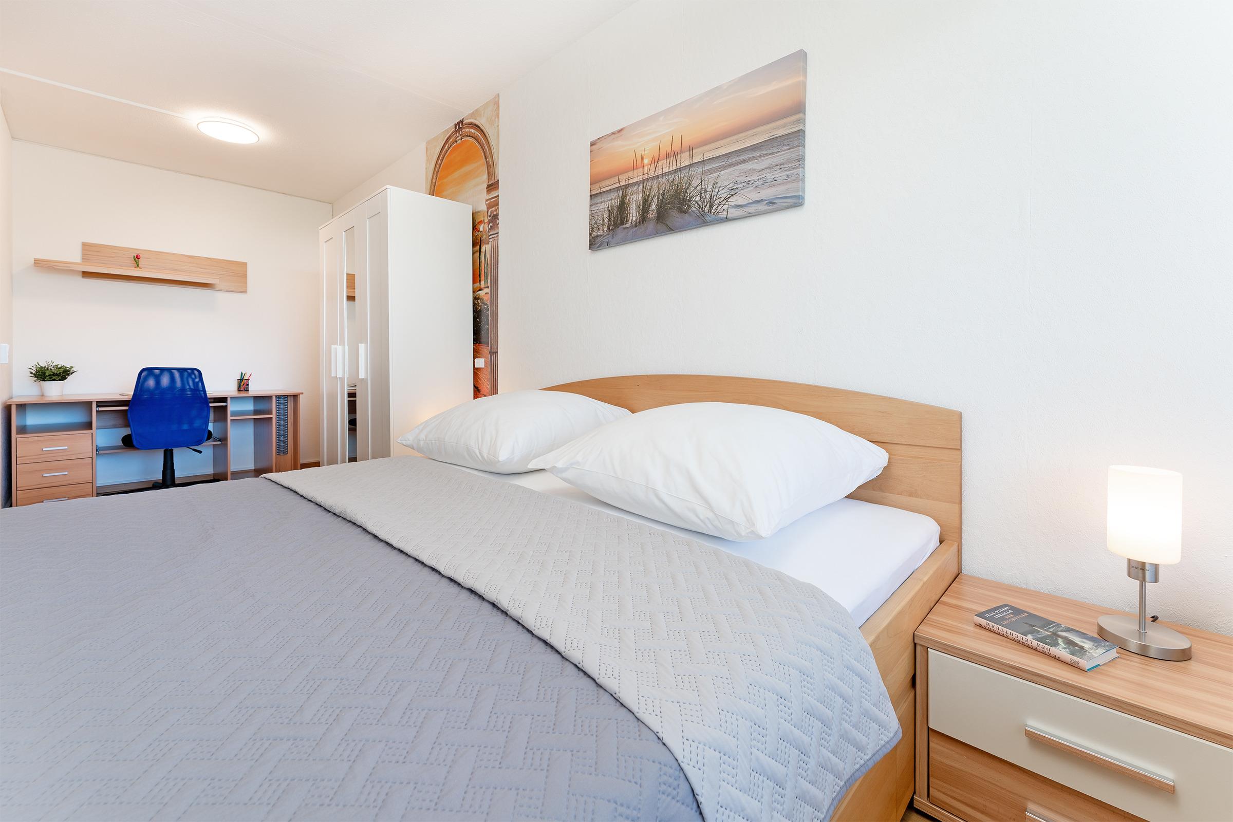 Schlafzimmer: 1 Doppelbett (180x200 cm), Kleiderschrank, Verdunkelungsmöglichkeit: Lamellenvorhang, Platz für Babybett vorhanden