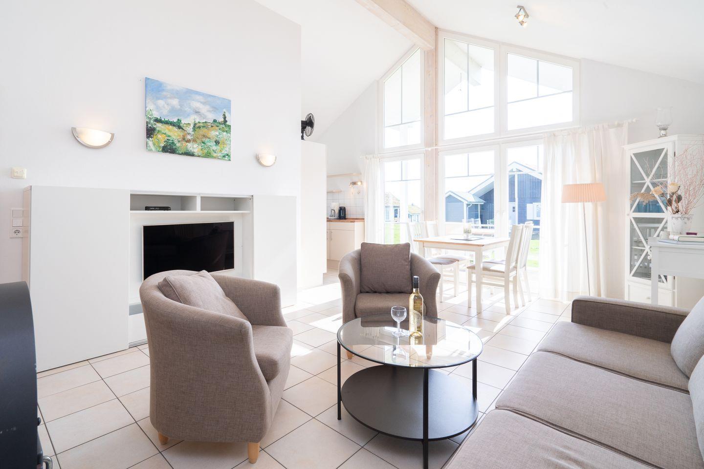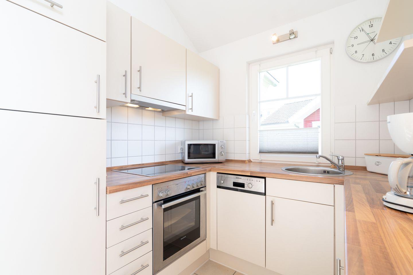 Auf einer Ebene stehen Ihnen ein Schlafraum und ein geräumiger Wohnraum mit Kamin und Zugang zur Terrasse mit Meerblick zur Verfügung, die Ostsee können Sie durch andere Häuser hindurch sehen. Die zum Essbereich hin offene, moderne Küche ist mit Geschirrspülmaschine, Herd und Mikrowelle voll ausgestattet. Der Kaminofen im Wohnbereich sorgt für gemütliche Stunden. Im Schlafraum steht ein Doppelbett. Im Bad finden Sie die Sauna, Waschmaschine, sowie eine Badewanne. Der Komfort einer eigenen Sauna wird sehr von unseren Wintergästen geschätzt. Die Beheizung erfolgt über Elektroheizungen und den Kamin.