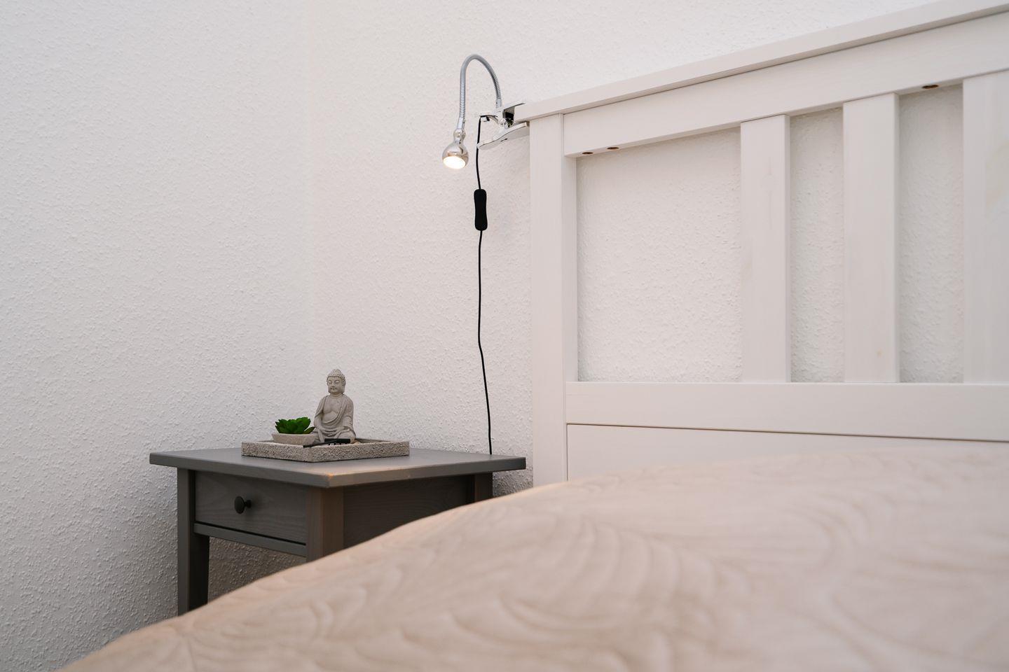 Die Ferienwohnung hat ein Schlafzimmer mit einem kleinen bequemen Doppelbett (140 cm x 200 cm). Im Wohnzimmer befindet sich eine ausziehbare Schlafcouch mit einer Liegefläche von 140 x 200 cm.