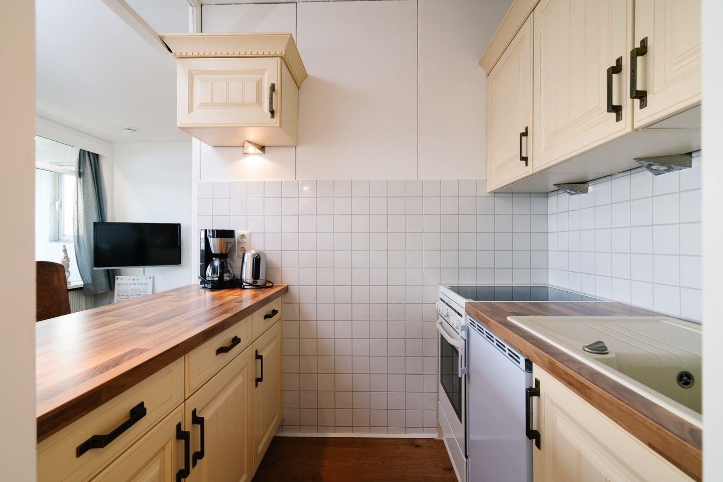 Die voll ausgestattete Küche überzeugt mit allem was man zur Selbstverpflegung braucht, wie Kühlschrank mit separatem Gefrierfach, Kochfeld, Backofen, Kaffeemaschine, Toaster und Wasserkocher.