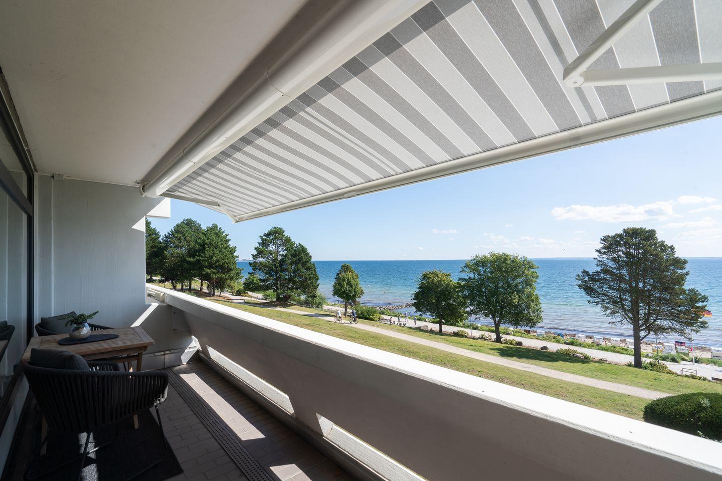 Der überdachte Balkon ist mit Gartenmöbeln ausgestattet und bietet Ihnen nicht nur die Möglichkeit, selbst bei wechselhaftem Wetter den wunderschönen Ausblick auf das Meer, den Strand und die Umgebung zu genießen, sondern auch Sicht- und Sonnenschutz durch eine Markise.