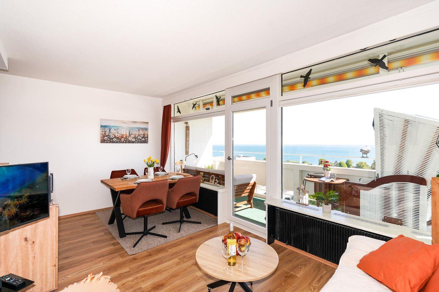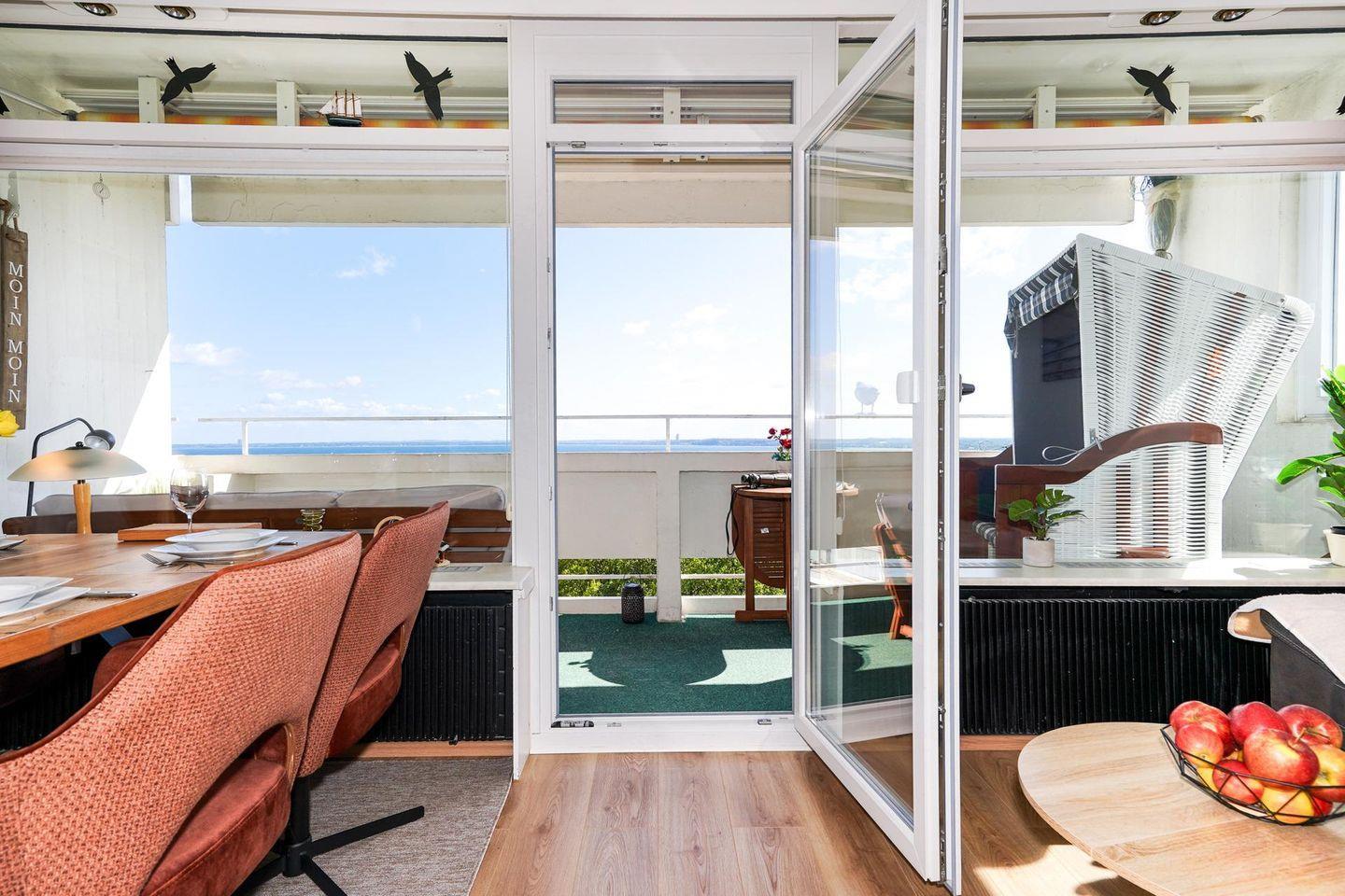 Die Wohnung befindet sich in der 9. Etage und ist bequem über Aufzüge erreichbar. Vom Südbalkon mit Markise genießen Sie einen traumhaften Blick über die Lübecker Bucht. Im Strandkorb lässt sich der Tag wunderbar bei einem Sundowner ausklingen.