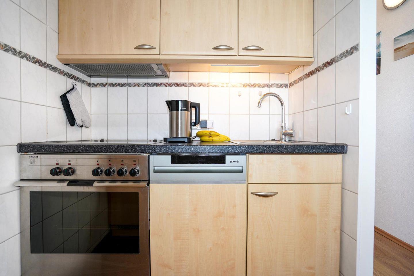Die kleine und offene Küche ist mit Backofen, Herd, Spülmaschine, Mikrowelle, Wasserkocher, Kaffeemaschine und Toaster ausgestattet - ideal, um auch im Urlaub entspannt zu kochen.