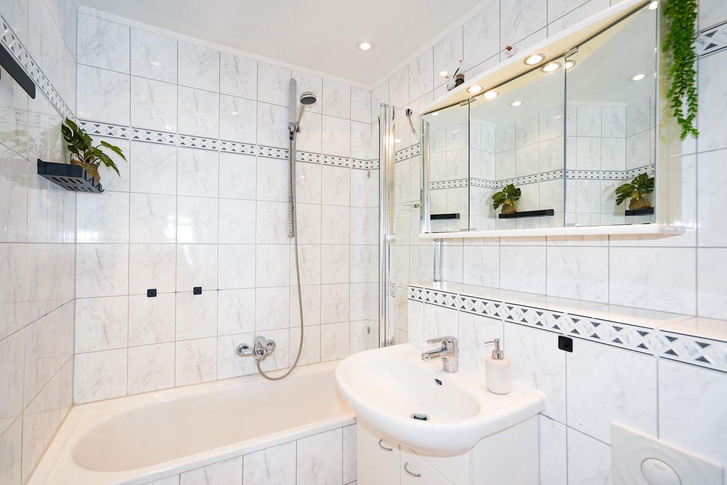 Das hell geflieste, innenliegende Badezimmer ist mit WC, Badewanne, Föhn und beheizbarem Handtuchhalter ausgestattet.
