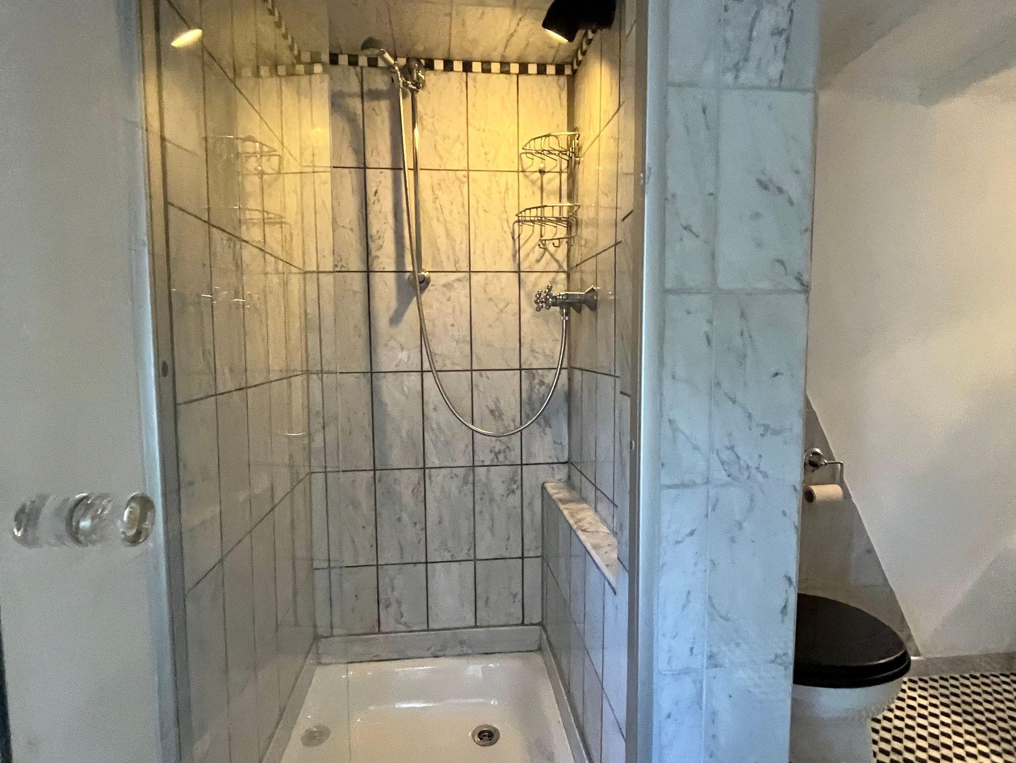 Das andere Badezimmer mit hellem Fliesenboden und Dusche mit Marmorfliesen überzeugt durch das historische Design.