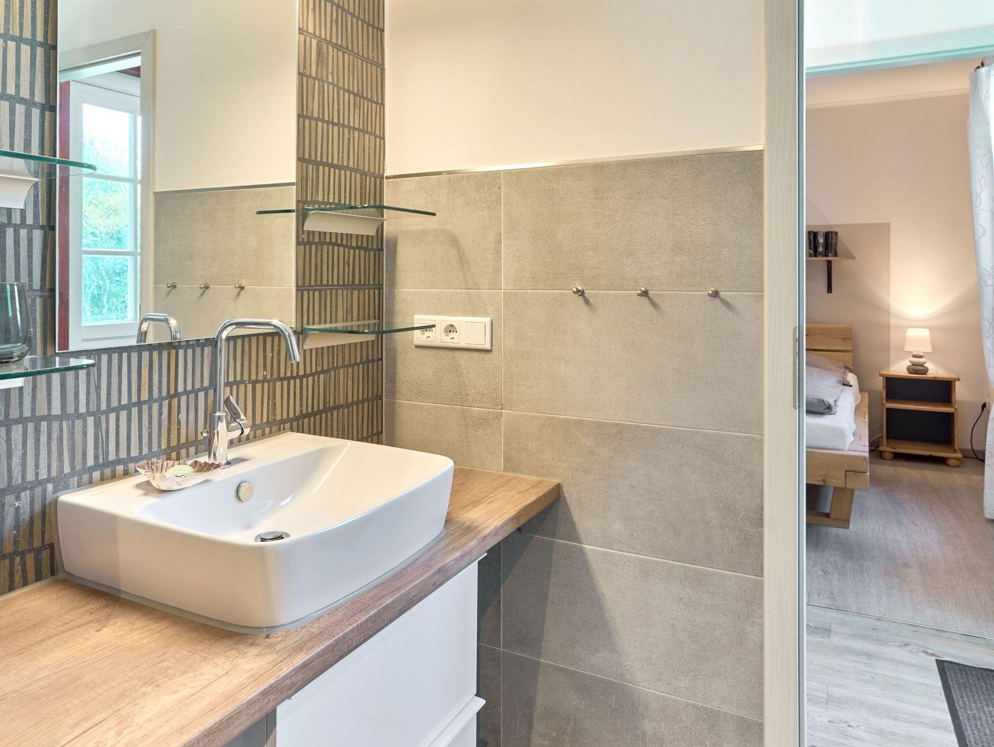Durch einen Flur, von dem das moderne Bad mit ebenerdiger Dusche und das Schlafzimmer mit Doppelbett abgehen, gelangt Ihr in den Wohnbereich, in dem man entspannt auf dem schönen Sofa Zeit verbringen mag. Eine offene, voll ausgestattete Küche und der freundliche Essbereich im angrenzenden Wintergarten lassen keine Wüsche offen. Das Haus ist durchweg hochwertig ausgestattet.