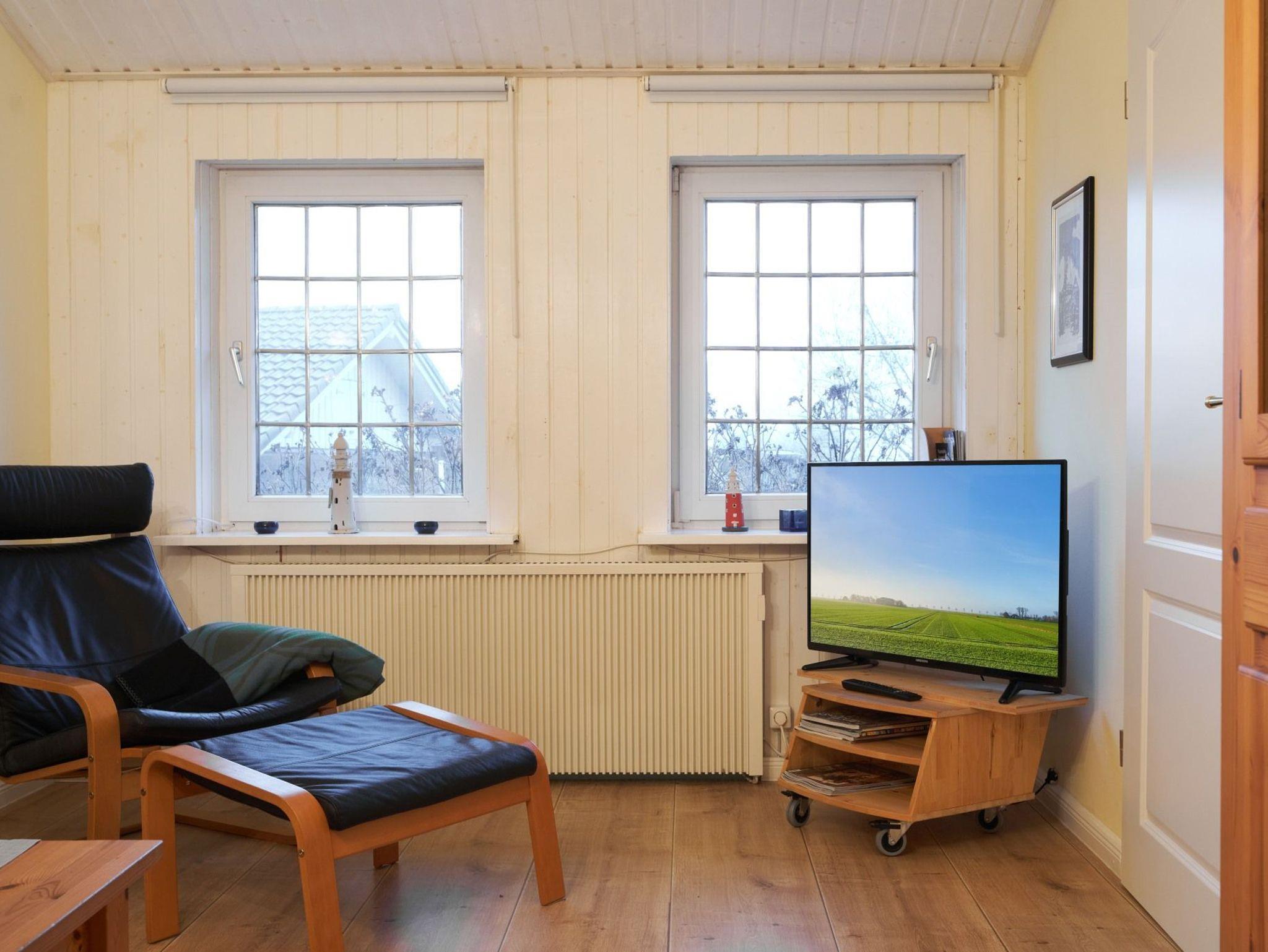 Das behagliche Wohnzimmer ist mit einem Flachbildfernseher und zwei bequemen Sofas ausgestattet, während die angrenzende geräumige Küche mit einem großen Esstisch genügend Platz für gesellige Mahlzeiten bietet. Vom Küchenbereich gelangen Sie in den Garten, der mit einer großzügigen Terrasse und einem privaten Strandkorb zum Entspannen einlädt. Im Erdgeschoss finden Sie zudem ein kompaktes Duschbad/WC und eine Waschmaschine. Die zwei Schlafzimmer im Obergeschoss laden zum Träumen unter dem romantischen Reetdach ein.