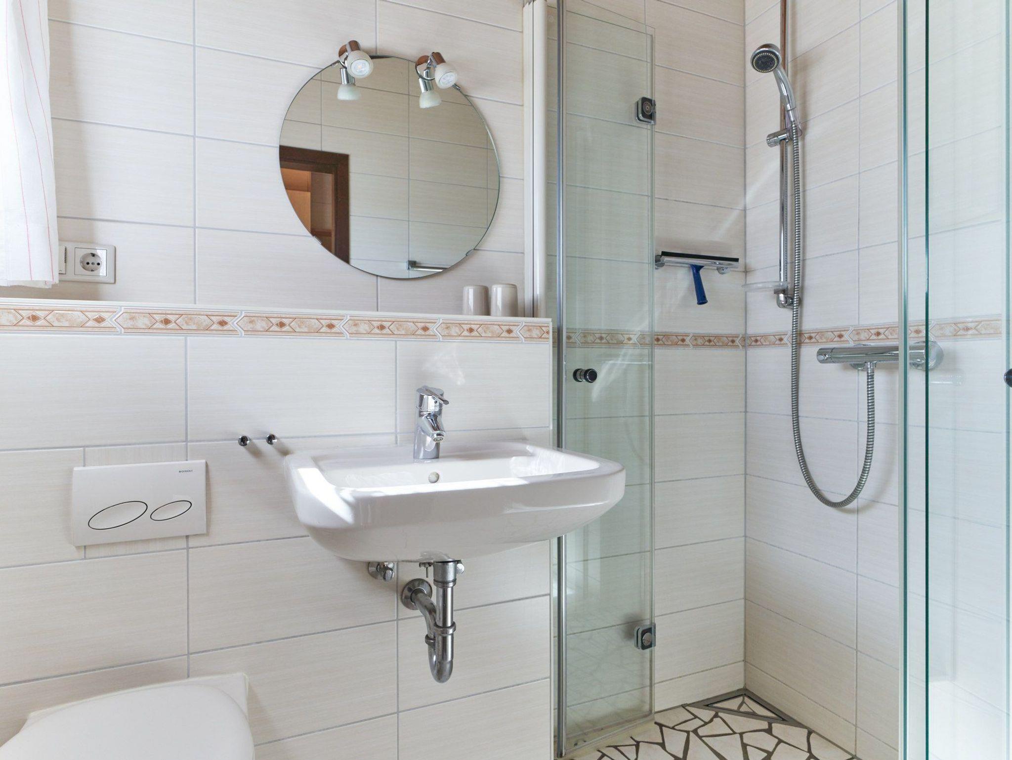 Modernes Duschbad: mit ebenerdiger Dusche und Fußbodenheizung, die auch im Flur für angenehme Wärme sorgt.