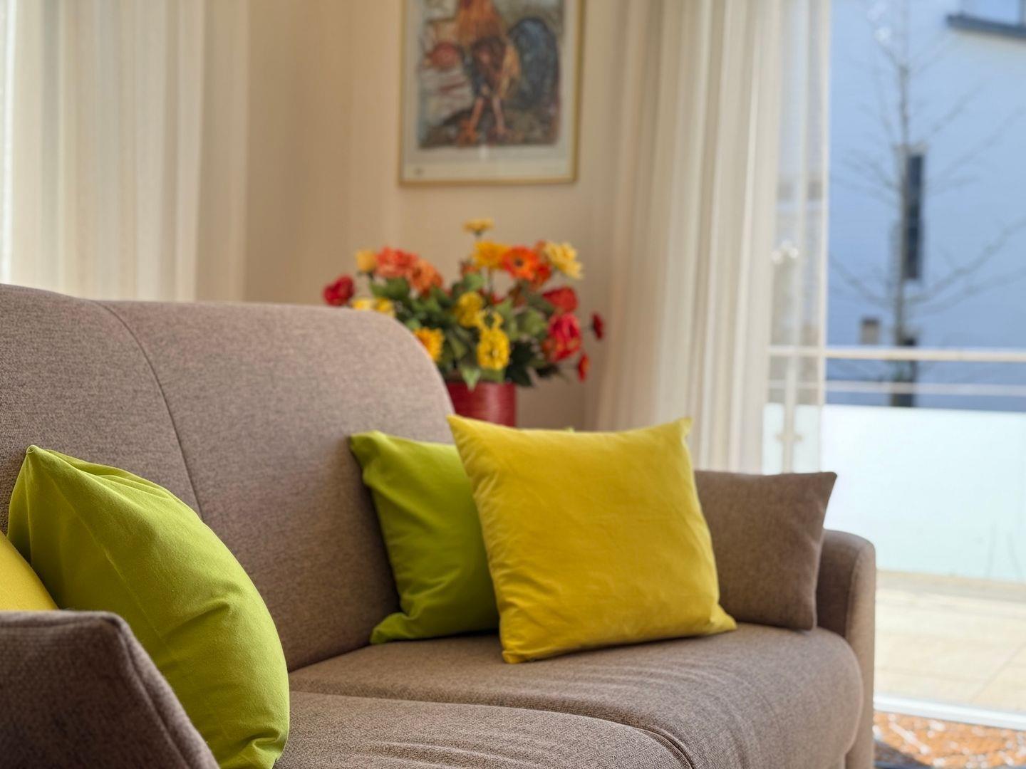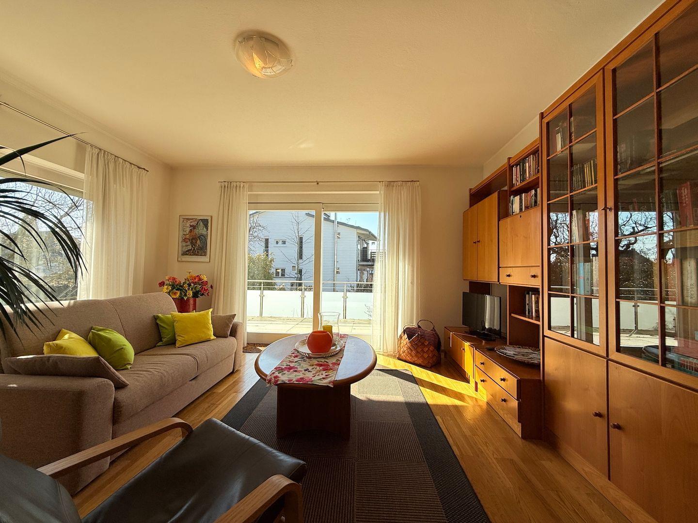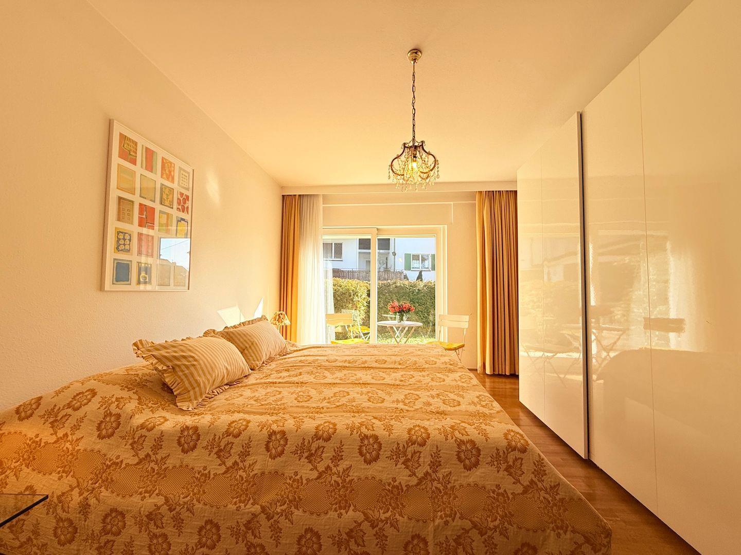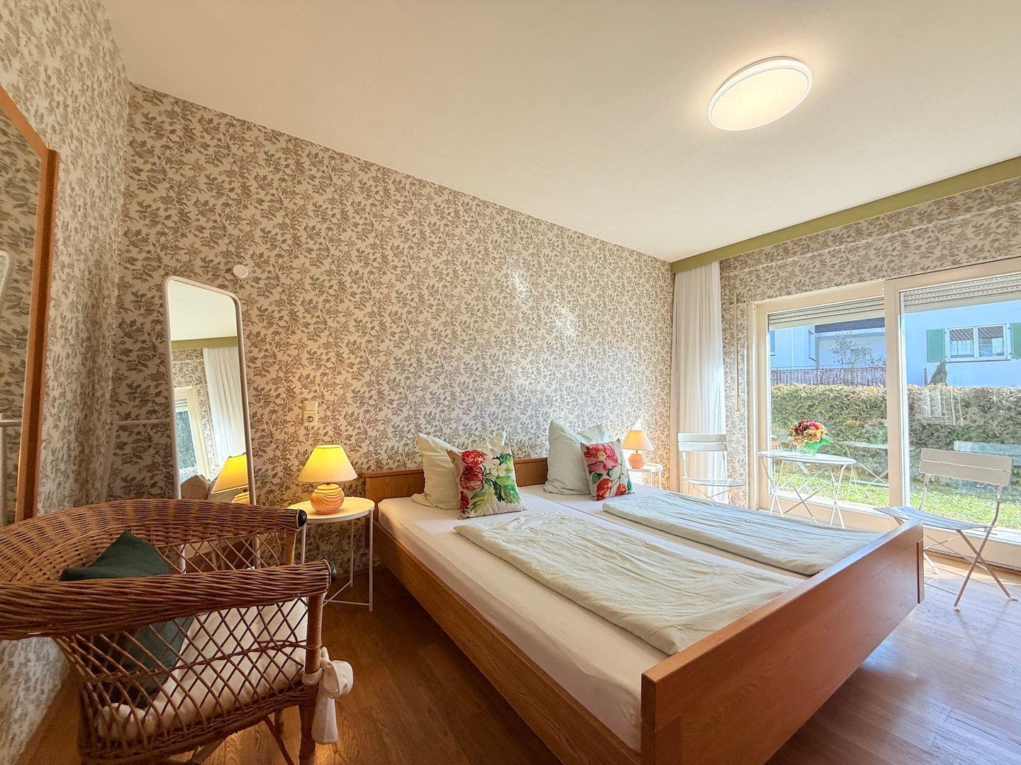 Ein Höhepunkt der Wohnung ist der schöne Balkon sowie die Terrasse, die mit Gartenmöbeln ausgestattet ist und Ihnen einen herrlichen Blick auf die umliegende Landschaft bietet. Genießen Sie hier Ihr Frühstück in der Morgensonne oder lassen Sie den Tag bei einem Glas Wein ausklingen. Der großzügige Garten mit Sonnenliegen und einer Liegewiese lädt zu erholsamen Momenten im Freien ein und ist ideal für Familien mit Kindern, die hier spielen können.