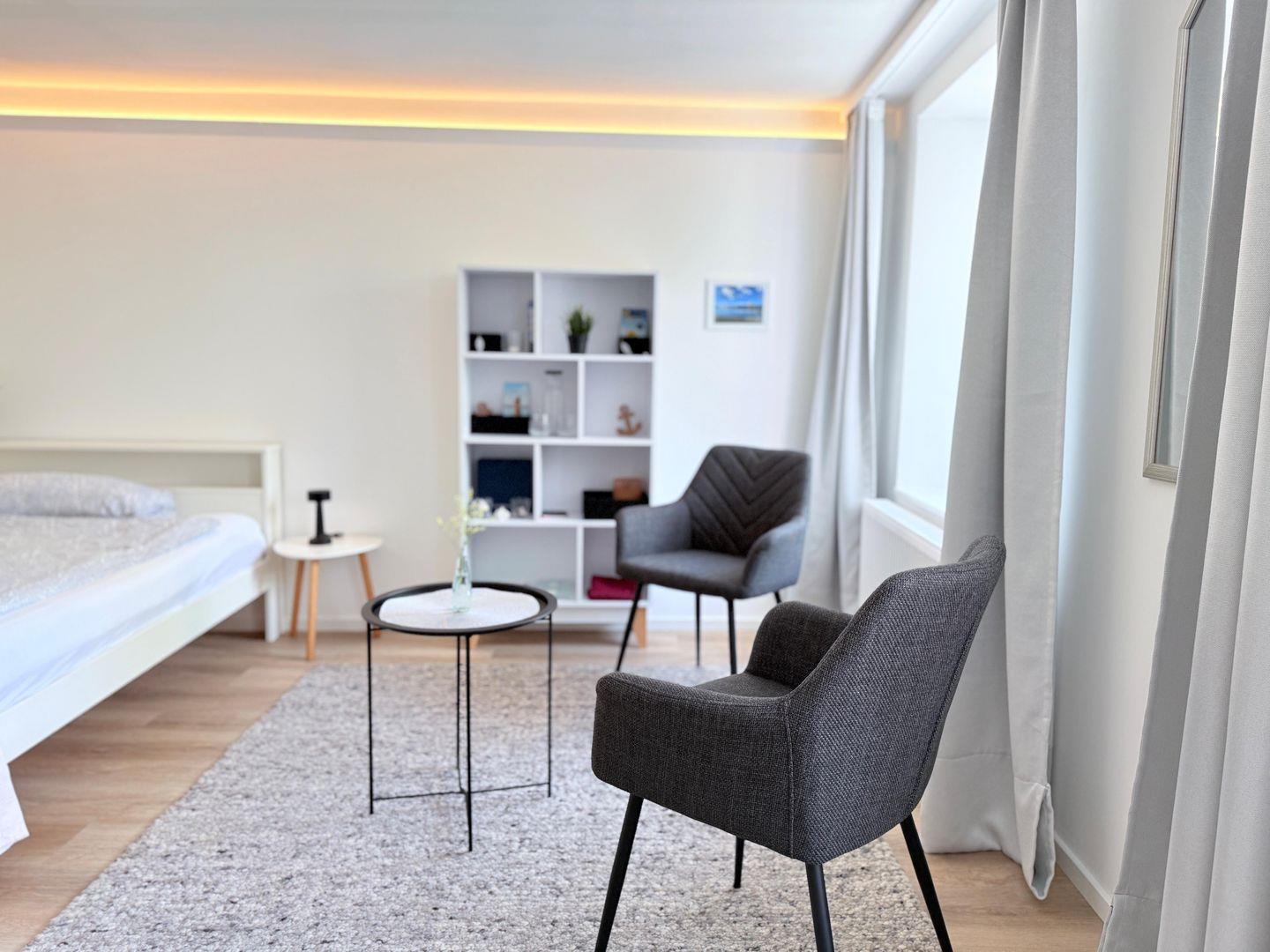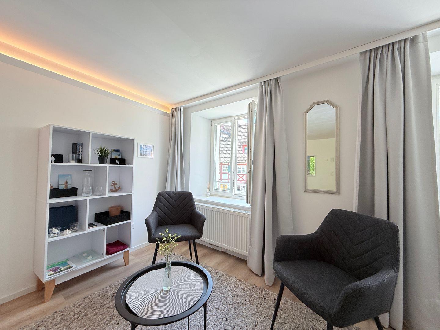 Die Wohnung befindet sich im ersten Stock eines freistehenden Hauses und eignet sich hervorragend für Paare oder Alleinreisende, die eine unvergessliche Zeit in der Nähe des Bodensees verbringen möchten. Mit einem Schlafzimmer, das Schlafmöglichkeiten für bis zu zwei Personen bietet (Bett breite 1,60m), ist es der ideale Rückzugsort nach einem erlebnisreichen Tag. Die Ausstattung ist auf das Wohlbefinden der Gäste ausgelegt. Besonders hervorzuheben sind die offene Küche, das gemütliche Wohnzimmer mit einem Esstisch sowie ein Badezimmer mit Dusche und Wanne. Genießen Sie die Annehmlichkeiten eines modernen Haushalts, wie etwa eine Spülmaschine, einen Kühlschrank mit Gefrierfach, eine Kaffeemaschine und vieles mehr. WLAN mit Geschwindigkeiten ab 100 Mbit/s sorgt dafür, dass Sie auch während Ihres Aufenthalts stets verbunden bleiben.