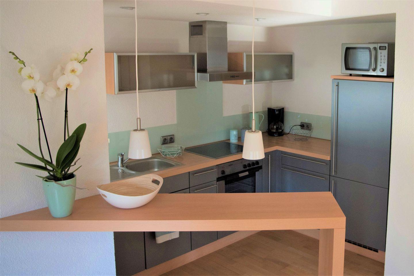 Die Ferienwohnung Birne liegt im Erdgeschoss des Obsthauses und hat 90m² Wohnfläche. Der Sitzplatz auf der Gartenterrasse ist zum historischen Ortskernrand, dem schönem Fachwerkhaus und der mediterran gestalteten Gartenanlage mit Brunnen ausgerichtet. Diese 3-Zimmer-Wohung hat 2 Schlafzimmer. Ein Schlafzimmer verfügt über ein Doppelbett (180x200cm), das andere hat 2 Einzelbetten (90x200cm). Eine Theke mit zusätzlichem Sitzplatz bereichert das schöne Ambiente und trennt die komplett eingerichtete Küche vom sehr großzügigen Wohn- Essbereich ab. Im geräumigen Bad befindet sich eine direkt begehbare Dusche, Badewanne, WC und Waschbecken. Außerdem bietet diese Wohnung ein separates WC mit Waschbecken.