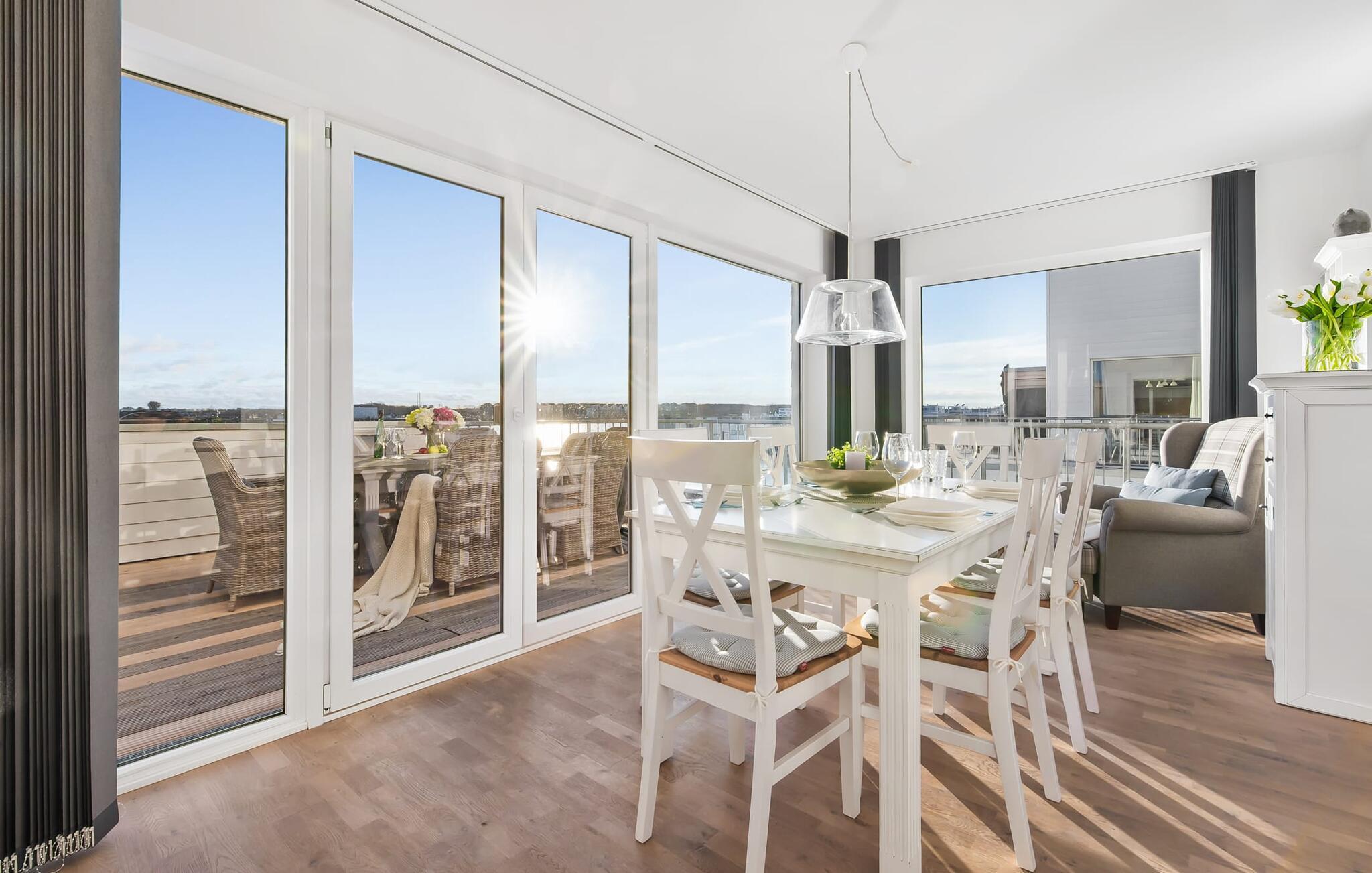 Vardagsrummet/matsalen i semesterlägenheten är ljus med panoramafönster från golv till tak med utsikt över hamnen och Schlei. Terrassen som gränsar till matplatsen erbjuder fantastisk utsikt över segel- och sportbåtshamnen i OstseeResort Olpenitz.