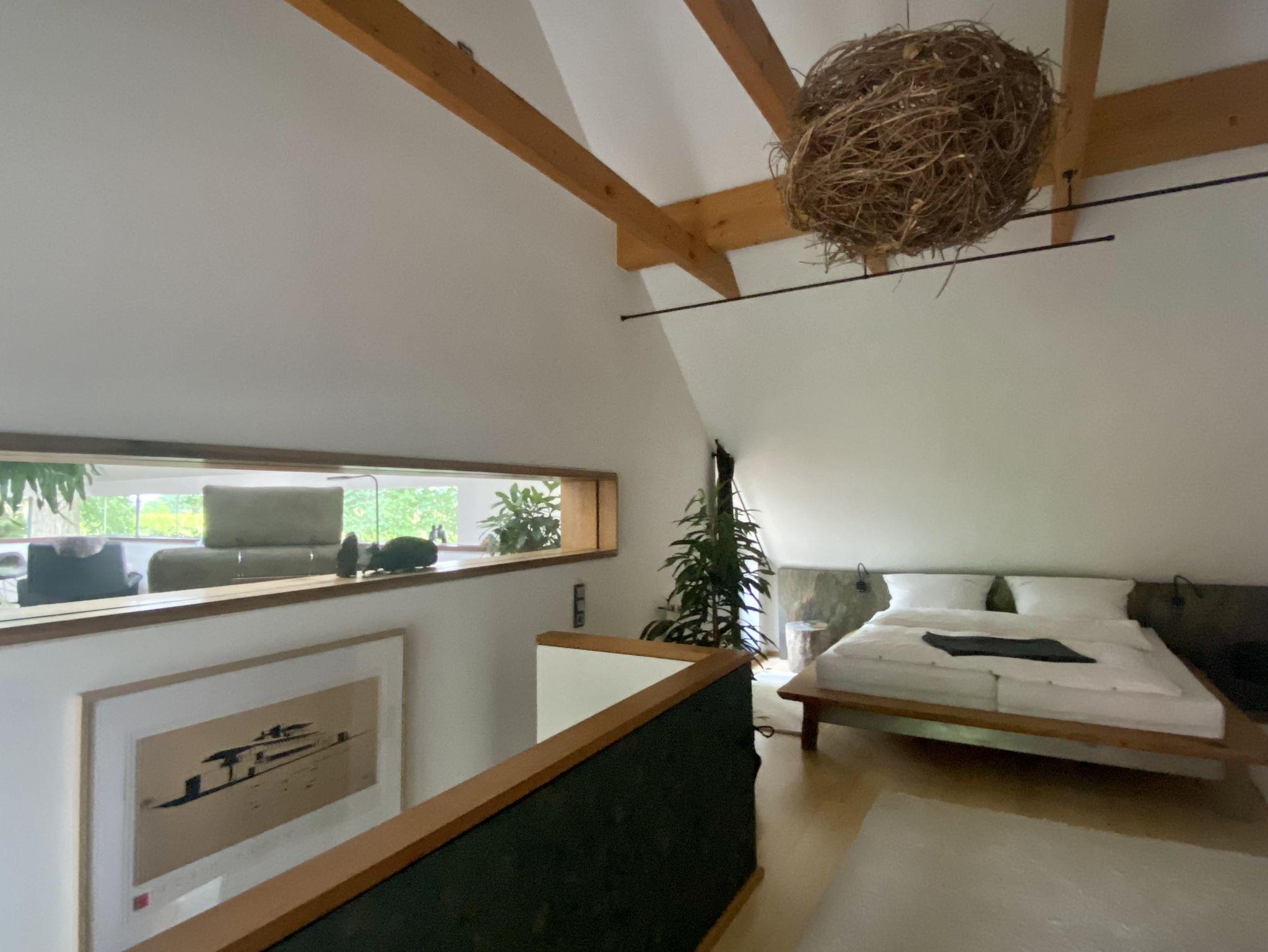 Über die Treppe gelangt man in das loftartig ausgebaute OG, mit Schlaf-Ankleidebereich, elektr. verstellbarem Massivholz-Doppelbett und dimmbaren Leseleuchten. Angrenzend liegt das separate Bad mit Wanne und Duschmöglichkeit. Über den offenen Flurbereich betritt man den lichtdurchfluteten Atelier-Wohnbereich mit Panorama-Verglasung. Diverse Sitz- und Ruhemöbel, ein kleiner Office-Bereich sowie digitale Endgeräte (TV/dab+Radio/Bluetoothbox) sind ebenso vorhanden, wie ein weiterer Kaminofen. Alle Räume, bis auf Küche und Entree, sind mit Massivholzböden belegt.