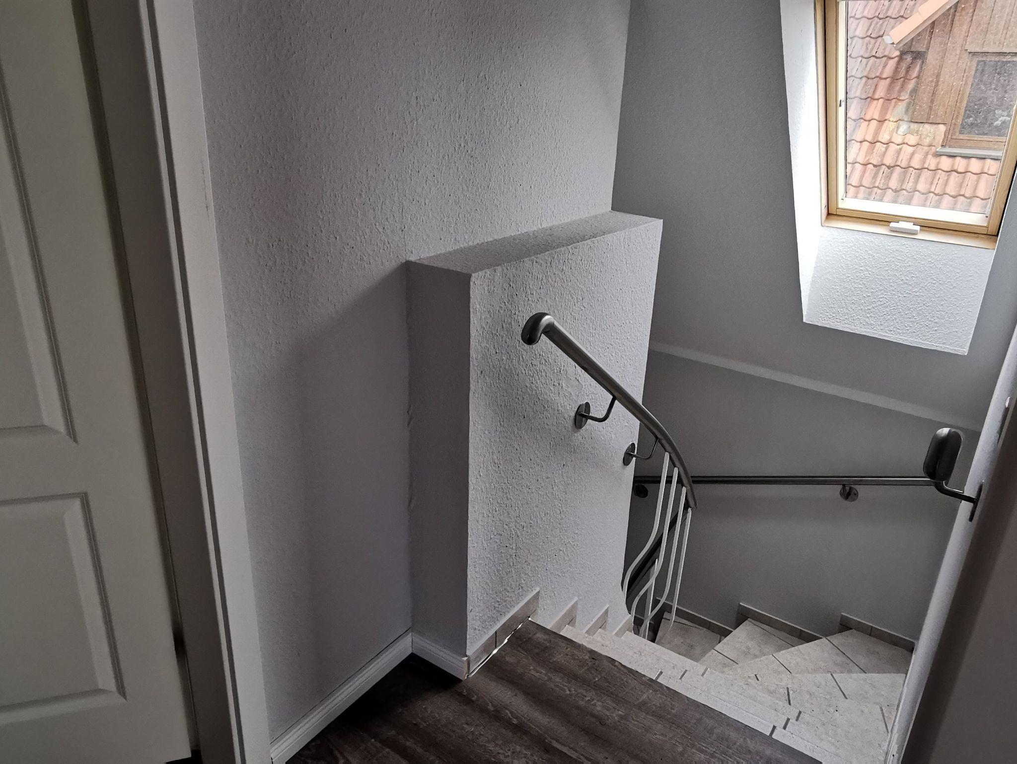 Weiter hinten links erwartet Sie unsere komplett ausgestattete Küche, in der Sie mit Kühl-/Gefrierkombination, Herd, Mikrowelle, Airfryer, Kaffeemaschine, Toaster und Wasserkocher alles vorfinden, was das Herz begehrt. Vom Flur aus gelangen Sie geradeaus in den gemütlichen Wohn- und Essbereich, der Sie direkt auf die sichtgeschützte Terrasse führt.
