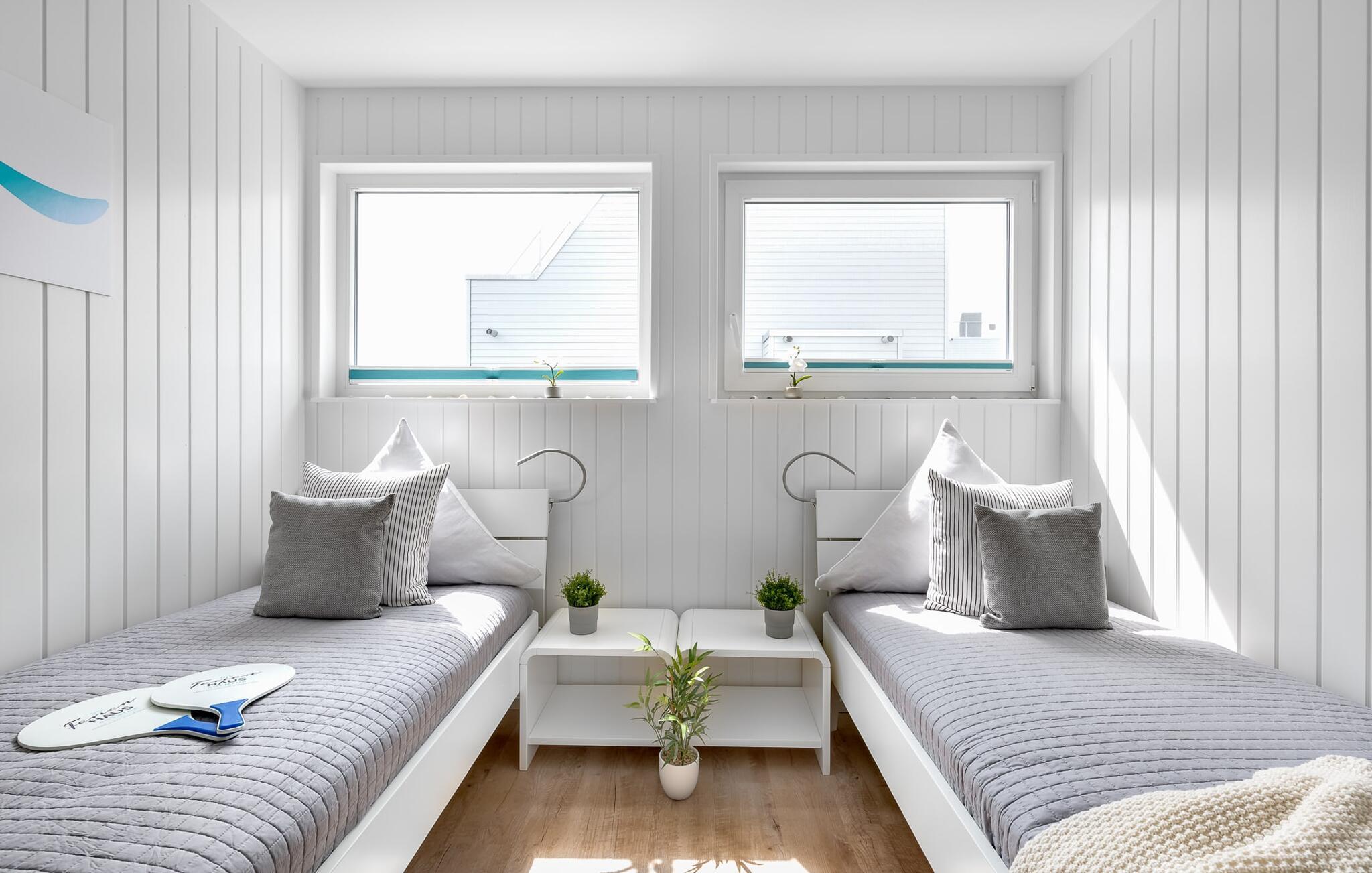 I det första sovrummet väntar en bekväm dubbelsäng med en sovyta på 1,60 x 2,00 m, där du kan se ut över vattnet och himlen när du ligger ner tack vare fönstren från golv till tak. Det andra sovrummet har två enkelsängar. Det finns en TV i båda sovrummen. Inbyggda garderober med bagagehyllor och gott om krokar erbjuder gott om förvaringsutrymme. Titta på de mjuka vågorna på den omslutande terrassen direkt från din solstol. Närmare Östersjön kan man inte komma!