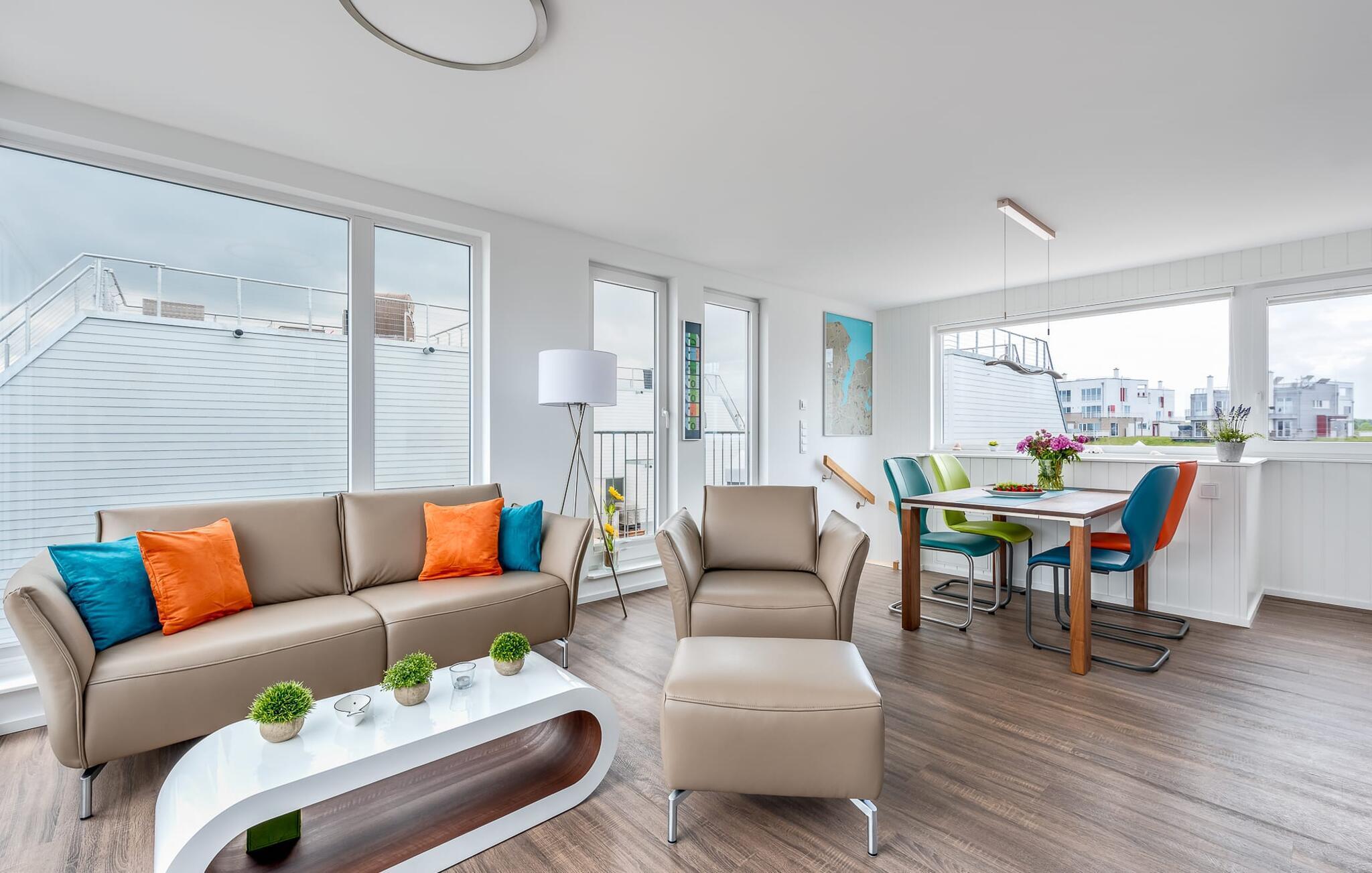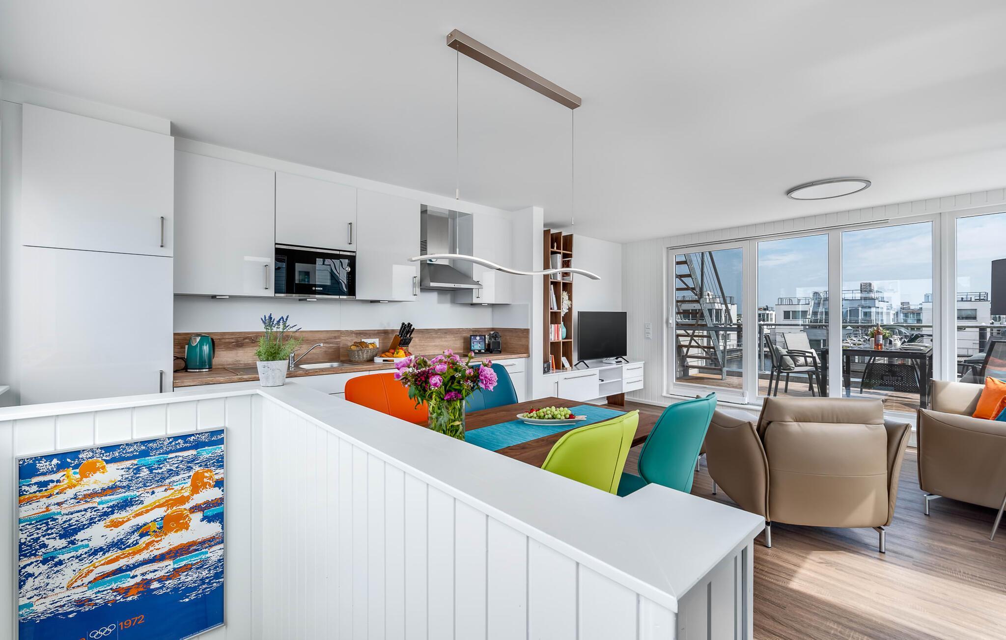 På första våningen välkomnas gästerna med en upphöjd utsikt över vattnet! Det välutrustade köket med matplats för 4 personer flyter sömlöst in i vardagsrummet. Den luftiga atmosfären stöds av eleganta och mycket mysiga möbler. Soffan och fåtöljen inbjuder till att dröja sig kvar. Och om det inte räcker med hamnbion, finns här också en TV med Magenta TV och en internetradio. Terrassen som gränsar till vardagsrummet är perfekt utrustad med ett stort trädgårdsbord och fyra bekväma stolar för en rejäl frukost i morgonsolen eller en trevlig grillkväll.