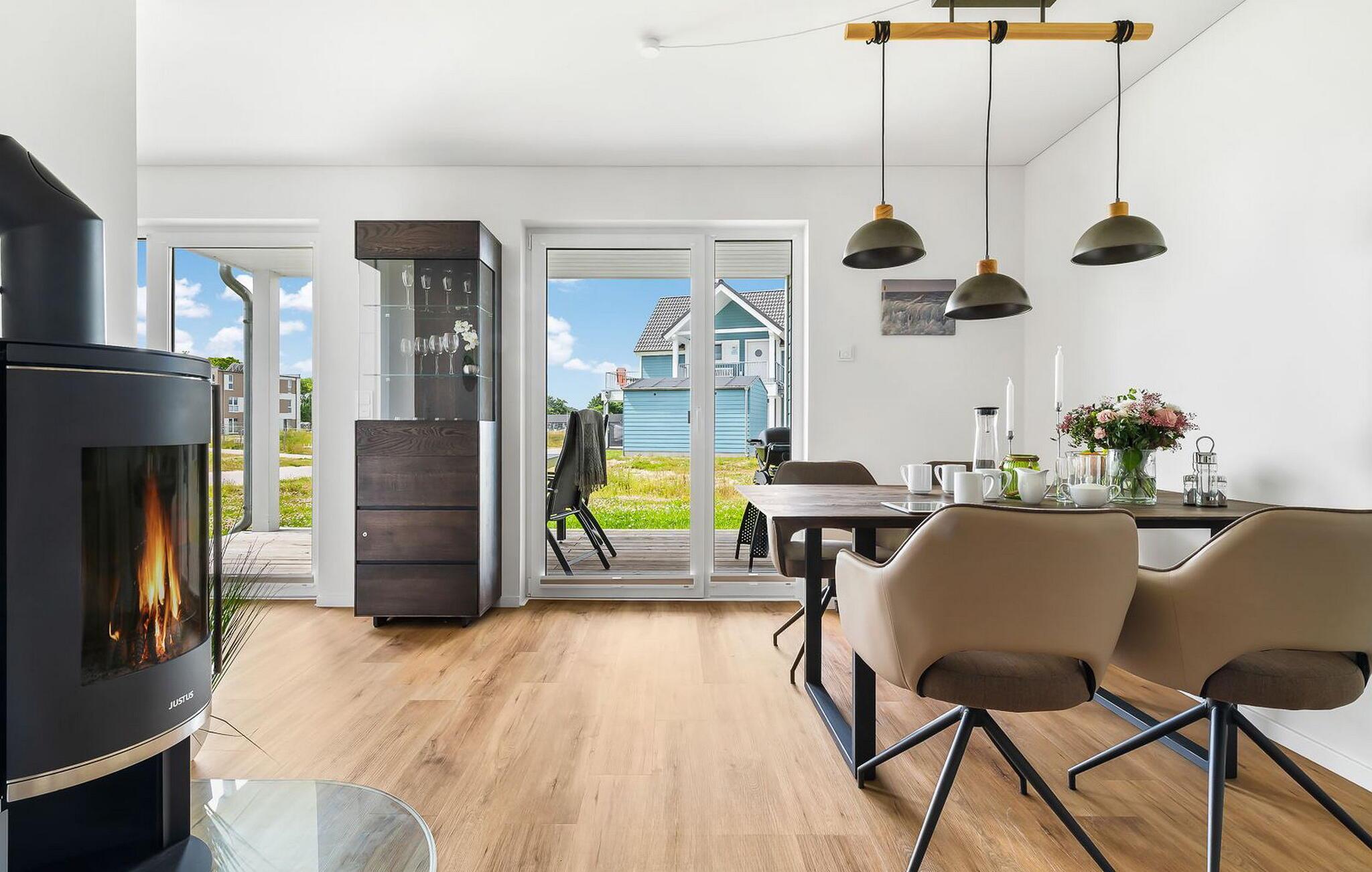 Vardagsrummet/matplatsen med öppen planlösning är lägenhetens hjärta. Här kan du tillbringa många avkopplande semestertimmar i soffan eller vid matbordet. Under nordiska dagar skapar den öppna spisen en mysig atmosfär. Gör dig bekväm och njut av din semester i Schlei-regionen.