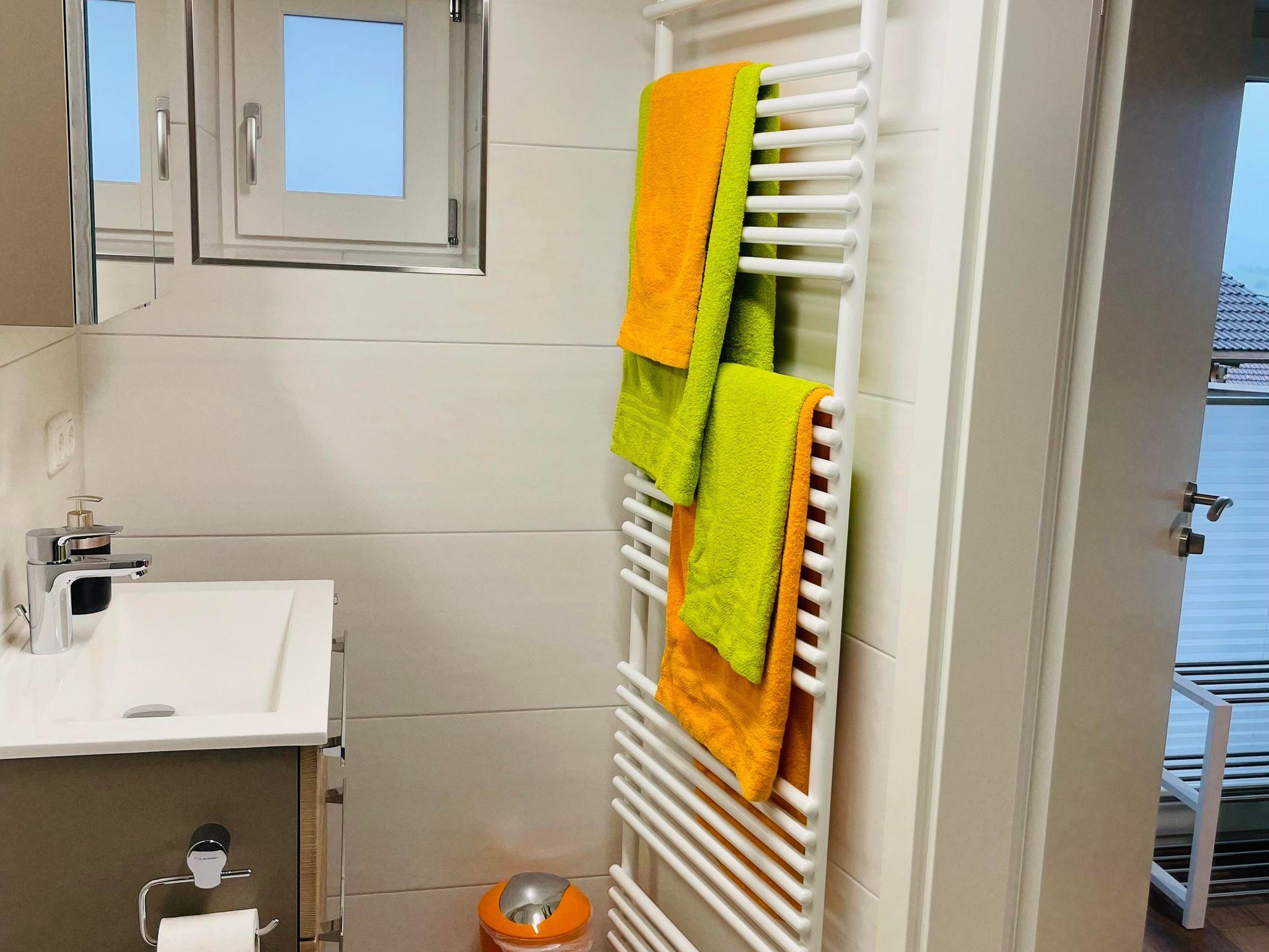 Das Badezimmer ist mit großer Dusche, WC und Föhn ausgestattet. Die Einbauküche verfügt über ein 2-Platten-Herd, eine Kaffeepad Maschine (Senseo), Kühlrschrank mit Gefrierfach, Spülmaschine, Wasserkocher und einem Toaster.