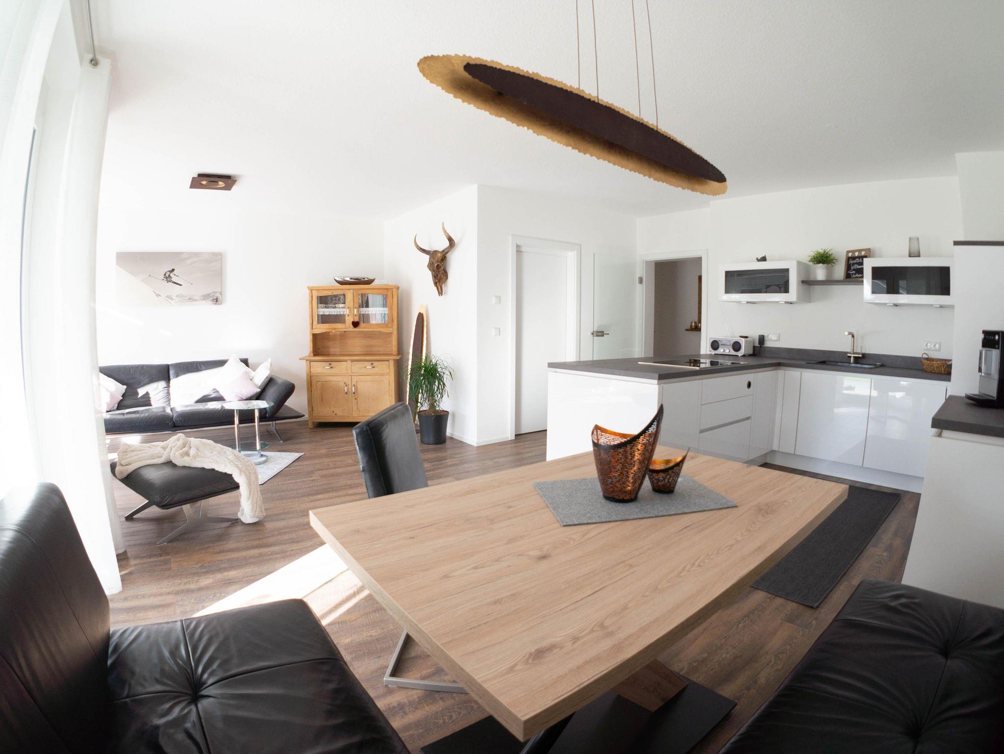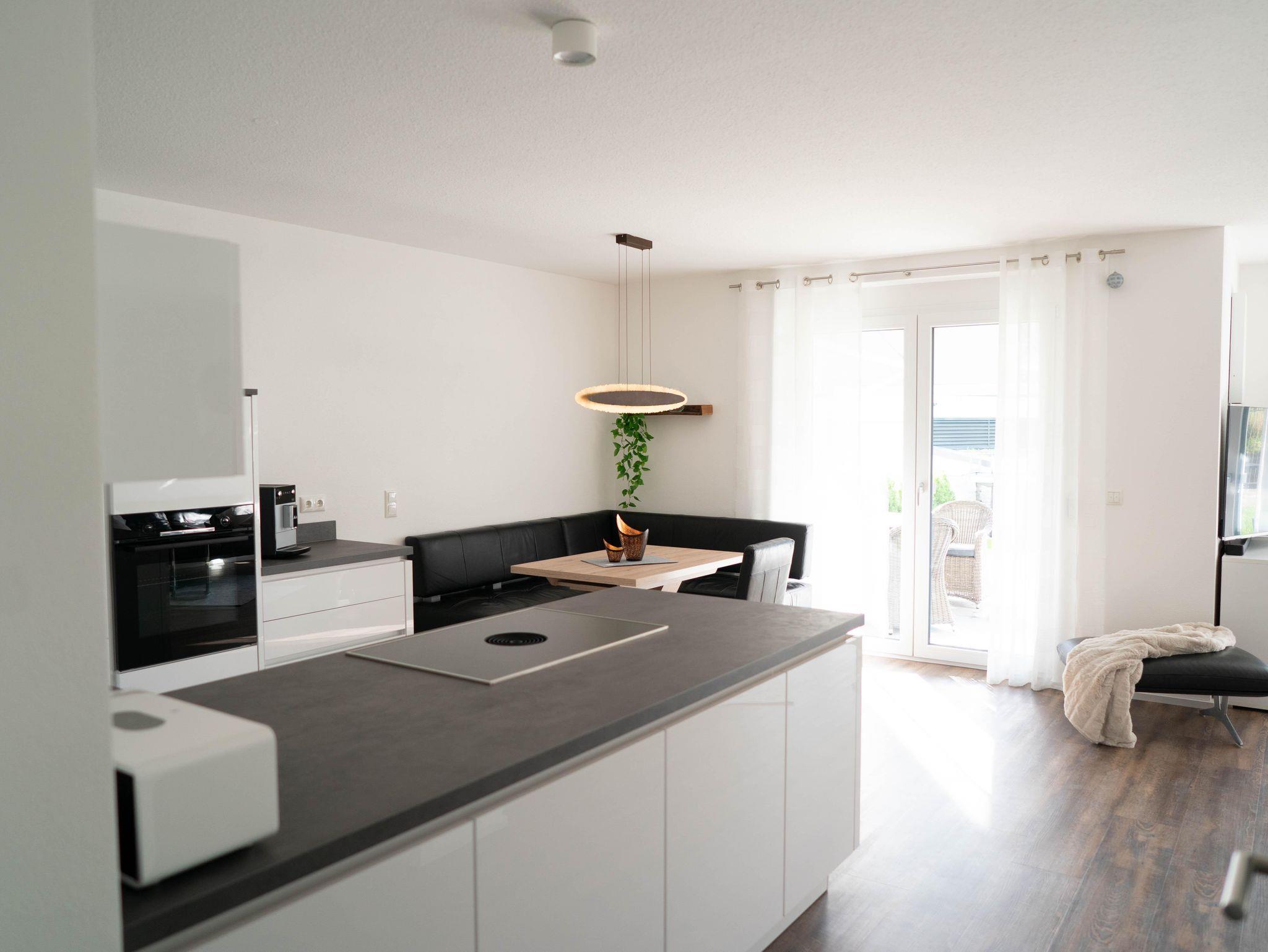 Die Küche grenzt direkt an die gemütliche Essecke. Das großzügige Ambiente mit Wohnen-Kochen-Essen (34 m²) lädt zu gemütlichen Stunden ein. Der angrenzende Wohnraum ist mit einem 55-Zoll großen 4K-Fernseher, Soundbar und Subwoofer ausgestattet - ein hochwertiges DAB-Radio mit Bluetooth-Funktion ist ebenfalls vorhanden.