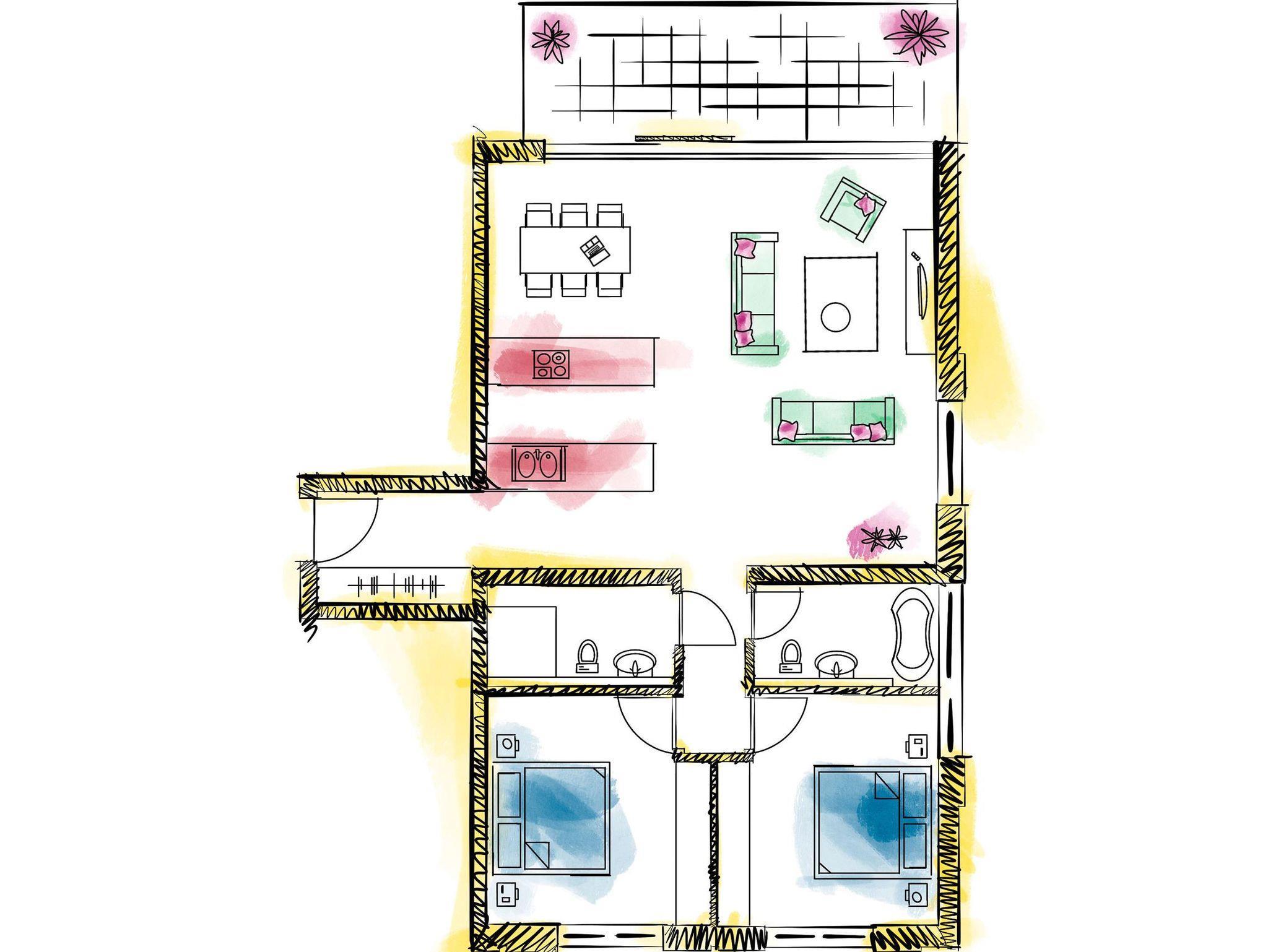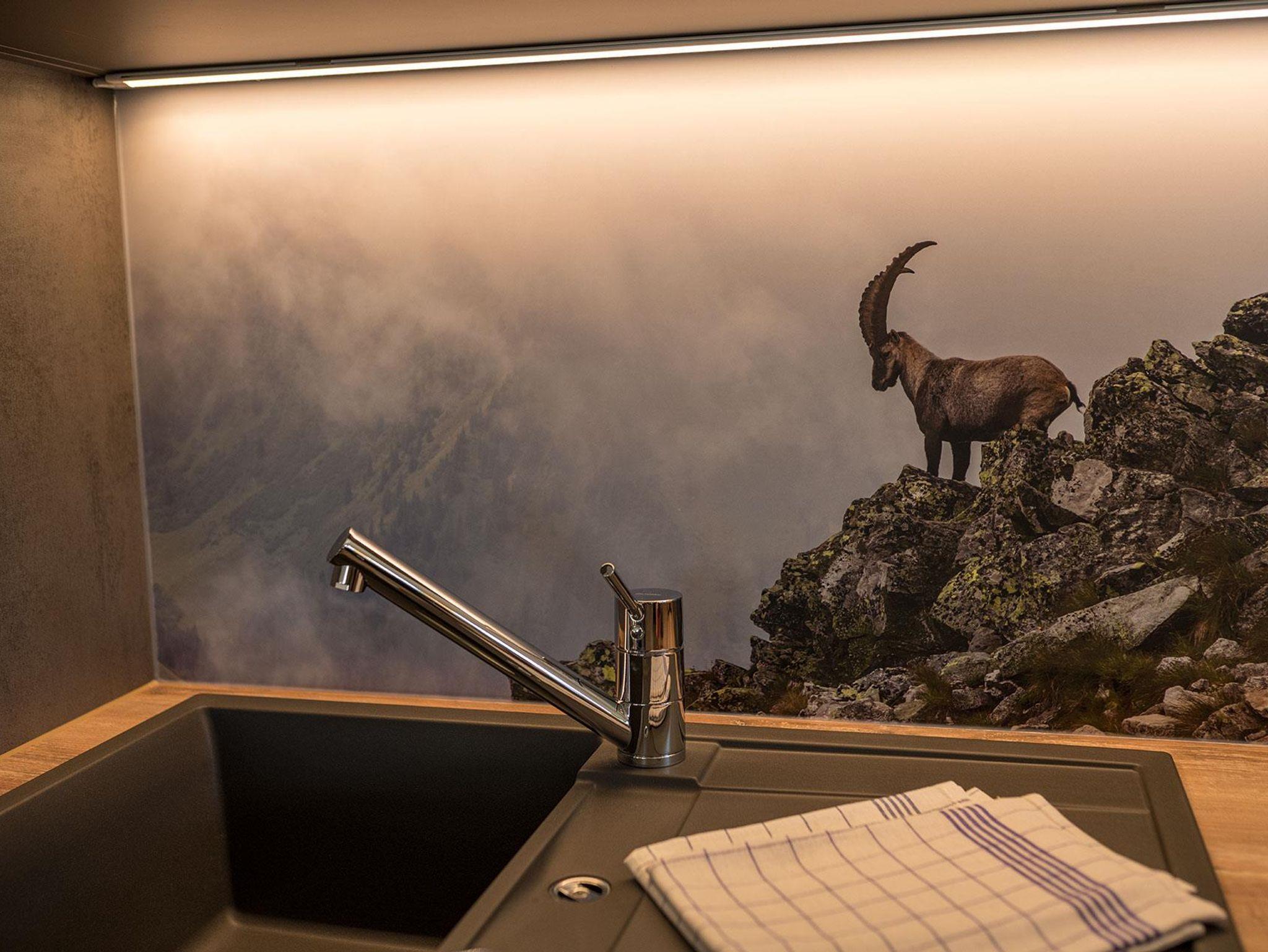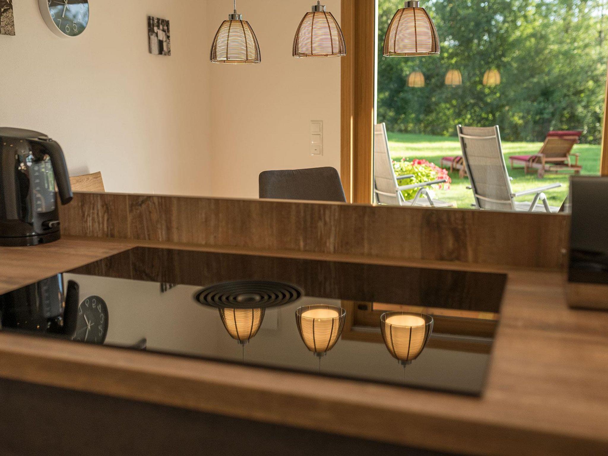 Wohn- und Essbereich mit grosszügiger Süd-Westverglasung und befahrbarer Terrasse, Flat-TV und Lounge Ecke,Küche mit Wasserkocher, Kaffeemaschine, rollstuhlgerechter Arbeitsplatte, Induktionskochfeld, Kühl- und Gefrierkombination, Geschirrspüler, Mikrowelle und Backofen.
