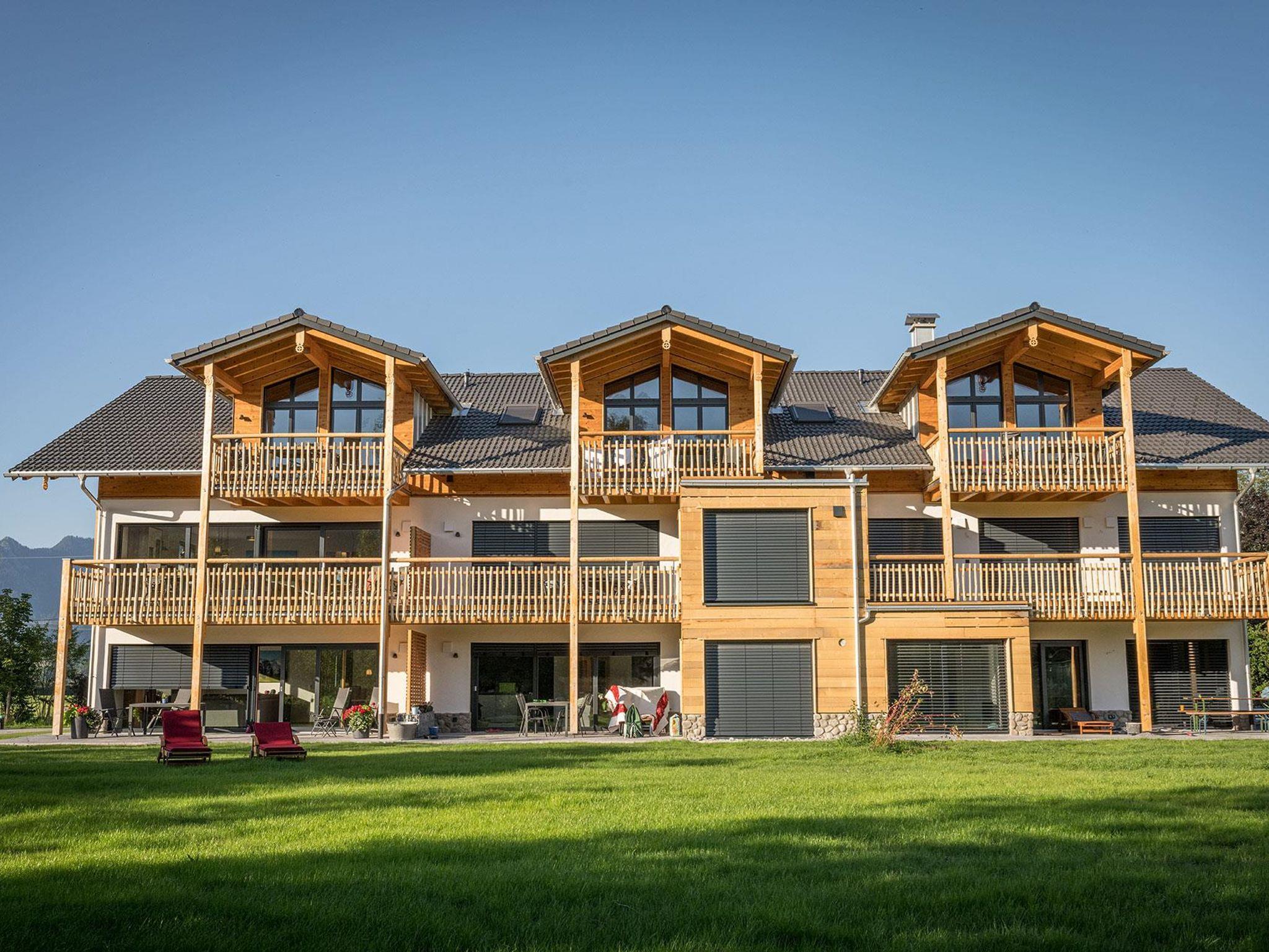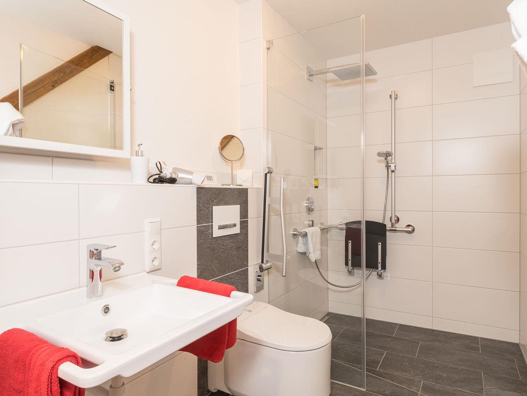 Ein barrierefreies Bad mit befahrbarer Regendusche und Sitz, Dusch WC und unterfahrbares Waschbecken sowie ein zweites Bad mit Badewanne und Regenbrause. Zwei Schlafzimmer mit duftenden Zirbenholzbetten und Allgäuer Luftbett-Matratzen. Kostenloser Parkplatz direkt vor der Tür im Carport.