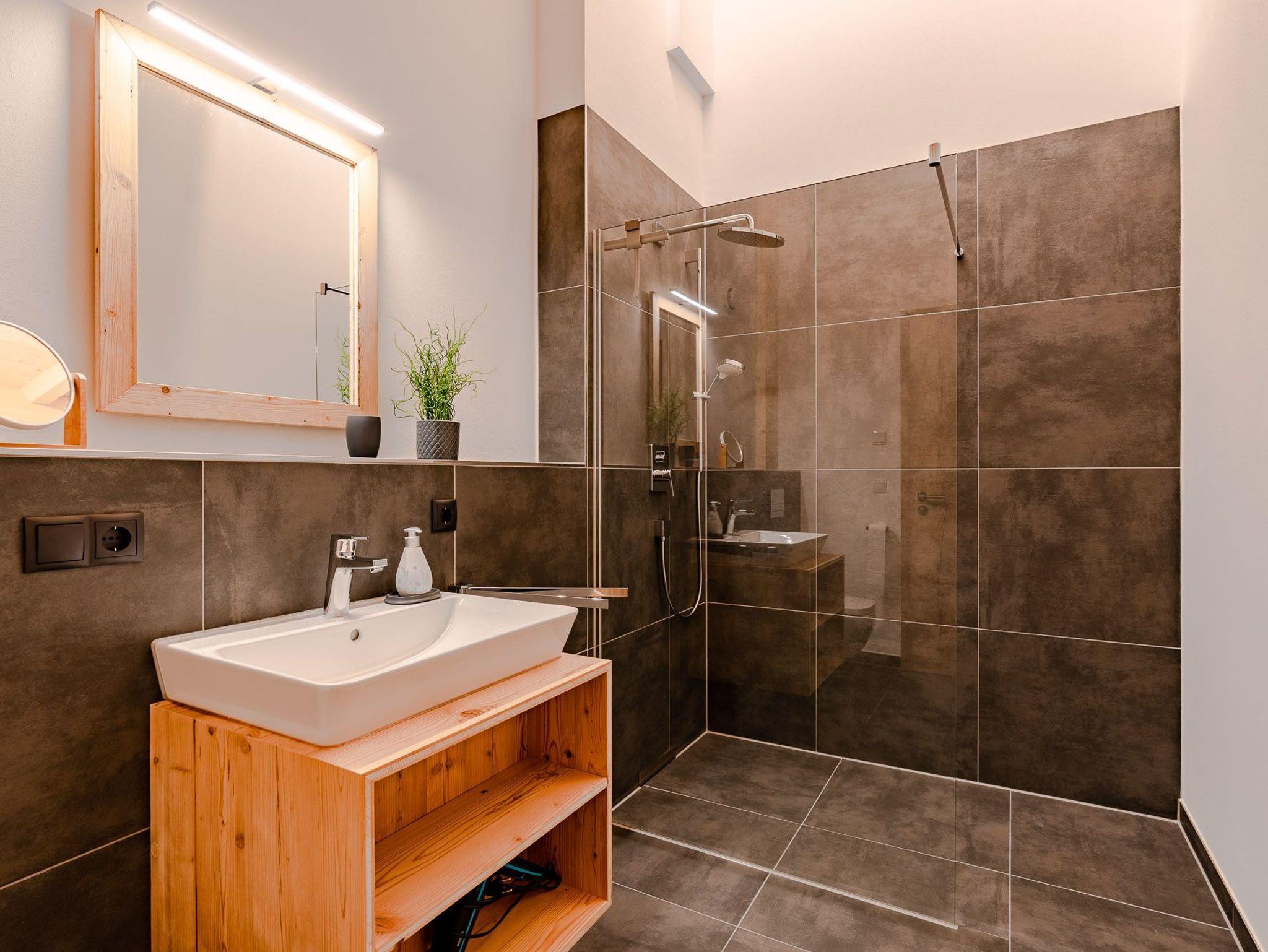 Des weiteren verfügt die Ferienwohnung über drei sehr schöne Schlafzimmer. Zwei der Schlafzimmer verfügen über ein Doppelbett und eines über ein hochwertiges, bequemes Schlafsofa. Ein weiteres Highlight dieses Chalets sind die zwei großzügig geschnittenen Badezimmer. Beide Badezimmer sind mit einer großen ebenerdigen Regendusche, Waschtisch und Toilette ausgestattet.