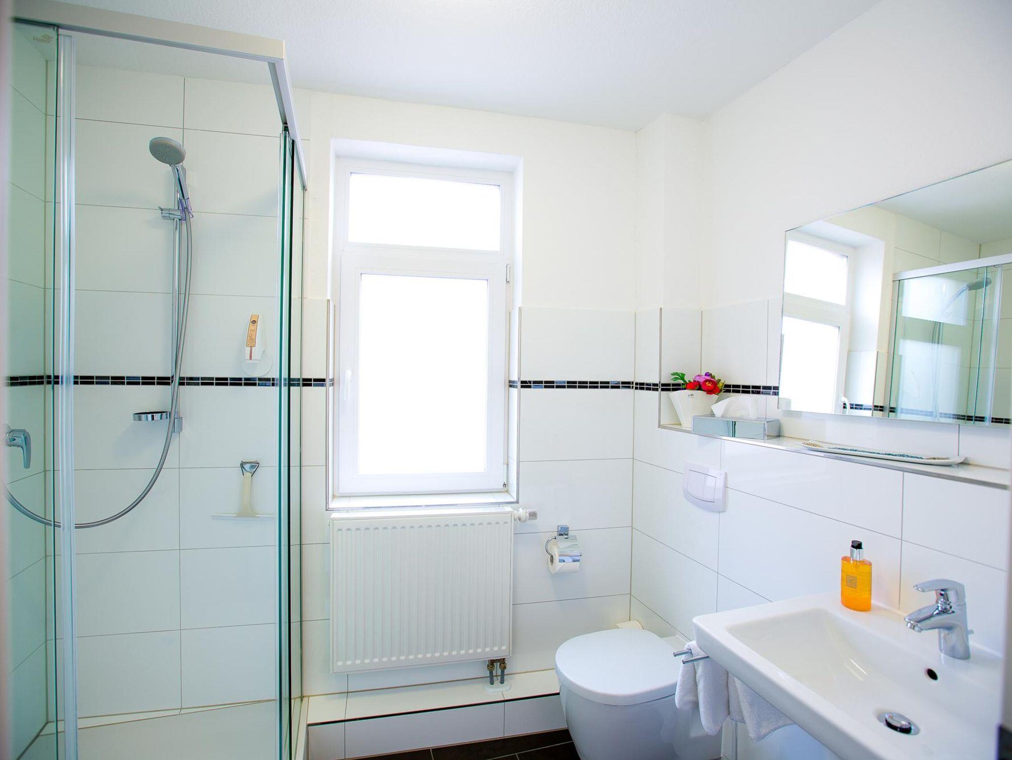 • Tageslichtbad mit großer Dusche, WC, Föhn
