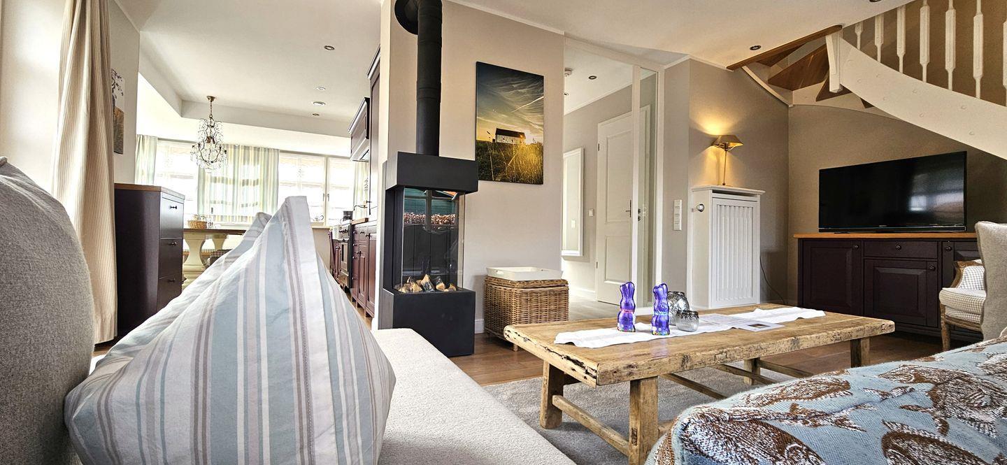 Die liebevolle Gestaltung spiegelt die Farben der Insel wieder. Der helle Wohnraum und die nostalgische Landhausküche laden zum Wohlfühlen, Entspannen und Beisammensein ein. Ins Dachgeschoss kann man sich auch mal zurückziehen, dort befinden sich 3 Schlafzimmer und ein Badezimmer.