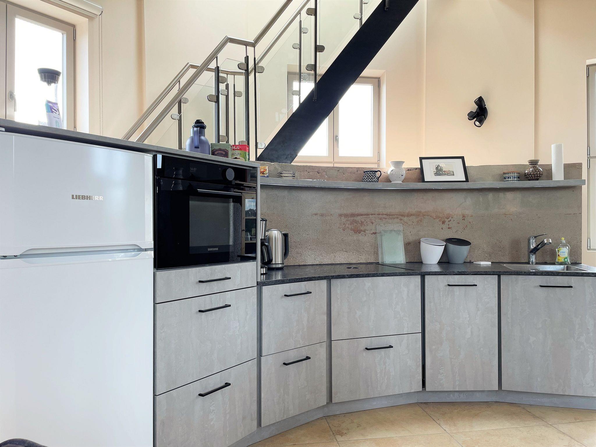Der Aufzug fährt bis zur 4. Ebene, von hier aus müssen Gäste einige Stufen nach oben steigen und gelangen nun in den großen Aufenthaltsraum mit angepasstem Küchenmobiliar. Ein großer Esstisch lädt alle Gäste an den Tisch. Zur Einrichtung gehören weiterhin ein Sofa und ein großer Kamin, der an kalten Tagen wohlige Wärme spendet.