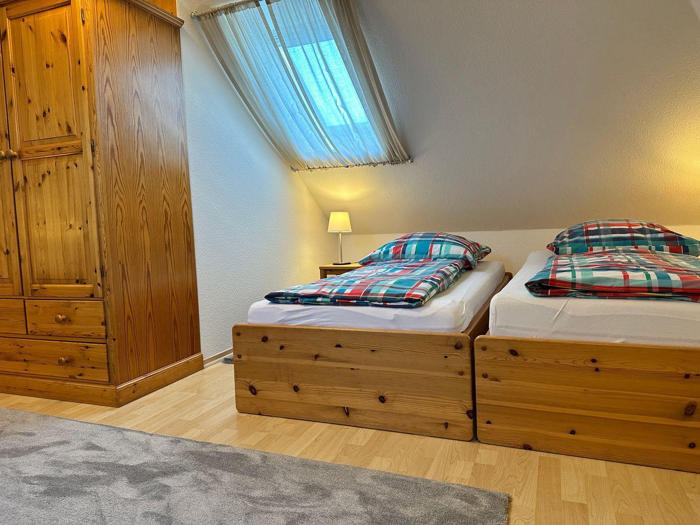 Das Doppelbett-Schlafzimmer im unteren Bereich der Wohnung bietet erholsamen Schlaf. Ein Kleiderschrank für Ihre Urlaubsgarderobe ist selbstverständlich. Als weitere Schlafmöglichkeiten gibt es im Staffelgeschoss der Wohnung drei weitere Betten. Auch hier gibt es Schränke und zusätzlich eine gemütliche Sitzecke. Kinderhochstuhl wie auch ein Kinderbett sind auf Anfrage vorhanden.