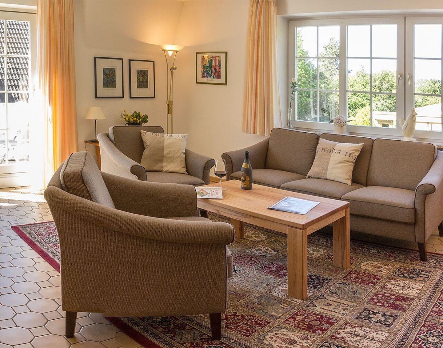 Das Wohnzimmer unterteilt sich in Wohn- und Essbereich. Das weiträumige Wohnzimmer bietet Kabel-TV und Bluetooth-Box sowie einen kostenfreien WLAN-Zugang (ohne Gewähr). Eine Couch und gemütliche Sessel warten auf spannende Krimiabende in Buch- oder Fernsehform.
