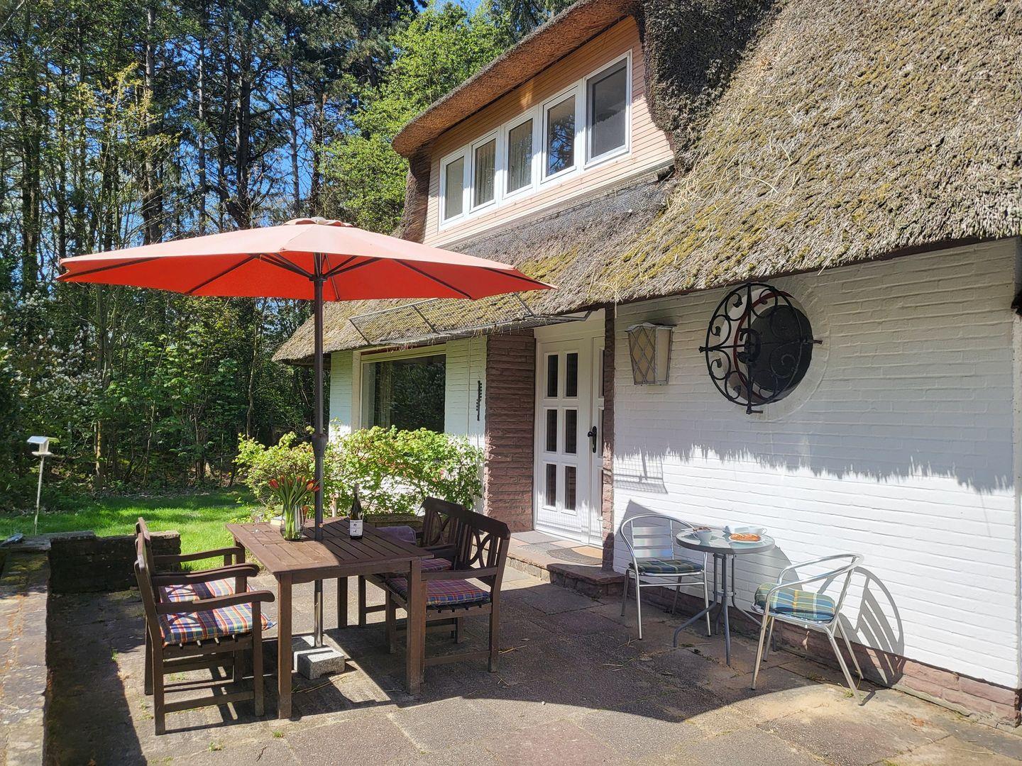 Ferienhaus unter Reetdach mit Terrasse und großem Garten. Wohnraum mit Kamin und Essecke, separate