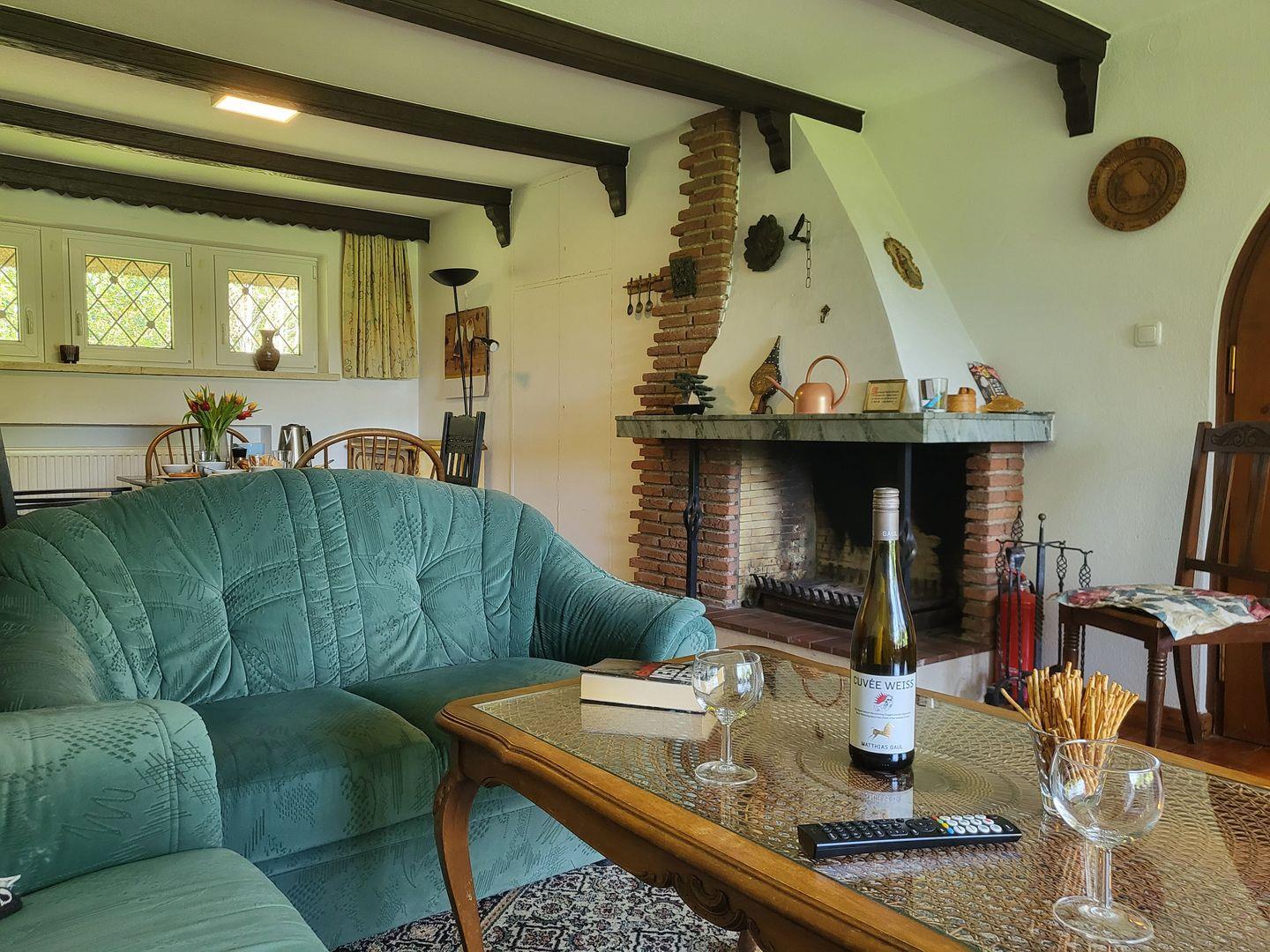 Das große, rustikale Wohnzimmer ist ausgestattet mit Kamin und einem Essbereich, Sofagarnitur und Flachbild-TV runden die Ausstattung ab.