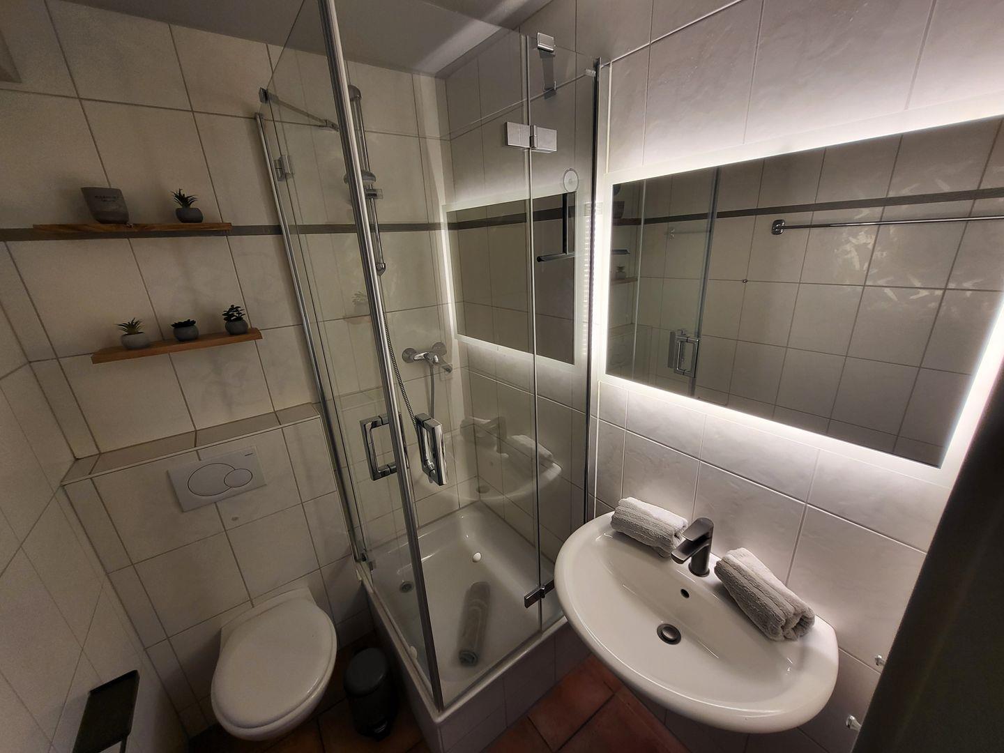 Ein Schlafzimmer mit 180x200cm Doppelbett sowie ein geräumiges Duschbad mit WC befinden sich ebenfalls im Erdgeschoss. Im großzügig gehaltenen Souterrain befindet sich das zweite Schlafzimmer der Ferienwohnung, dort steht ein 180x200cm Doppelbett sowie ein eigener Flachbild-TV bereit. Ein weiteres Duschbad befindet sich ebenfalls im Souterrain.