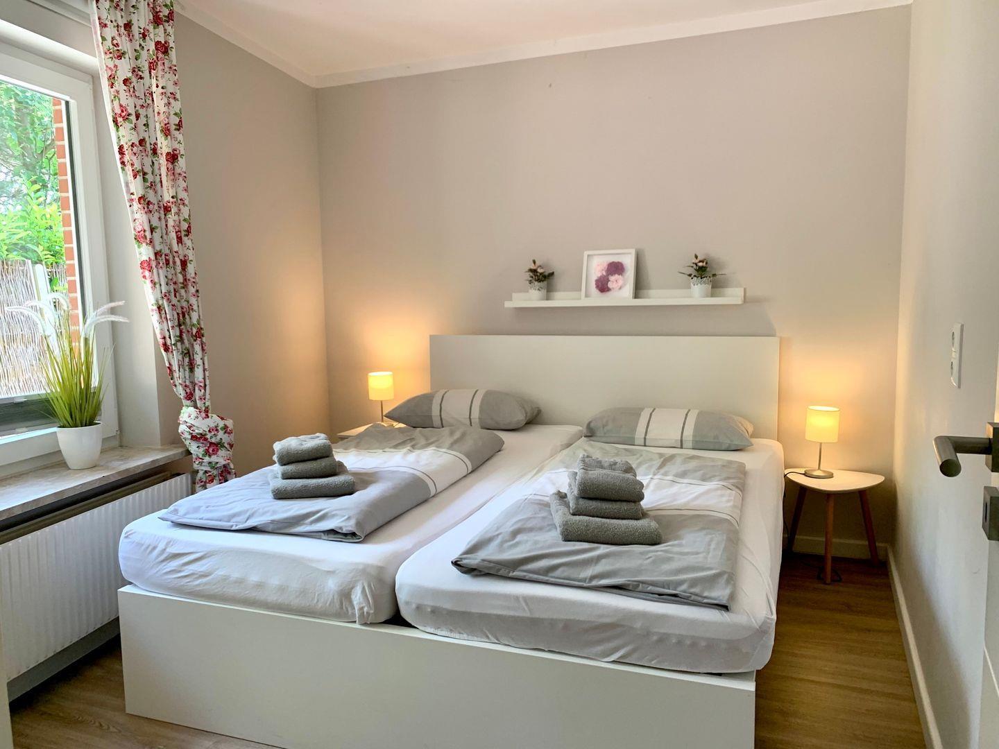 Das separate Schlafzimmer verfügt über ein großzügiges 160x200cm Doppelbett. Die Ferienwohnung ist ausgestattet mit Duschbad und WC.
