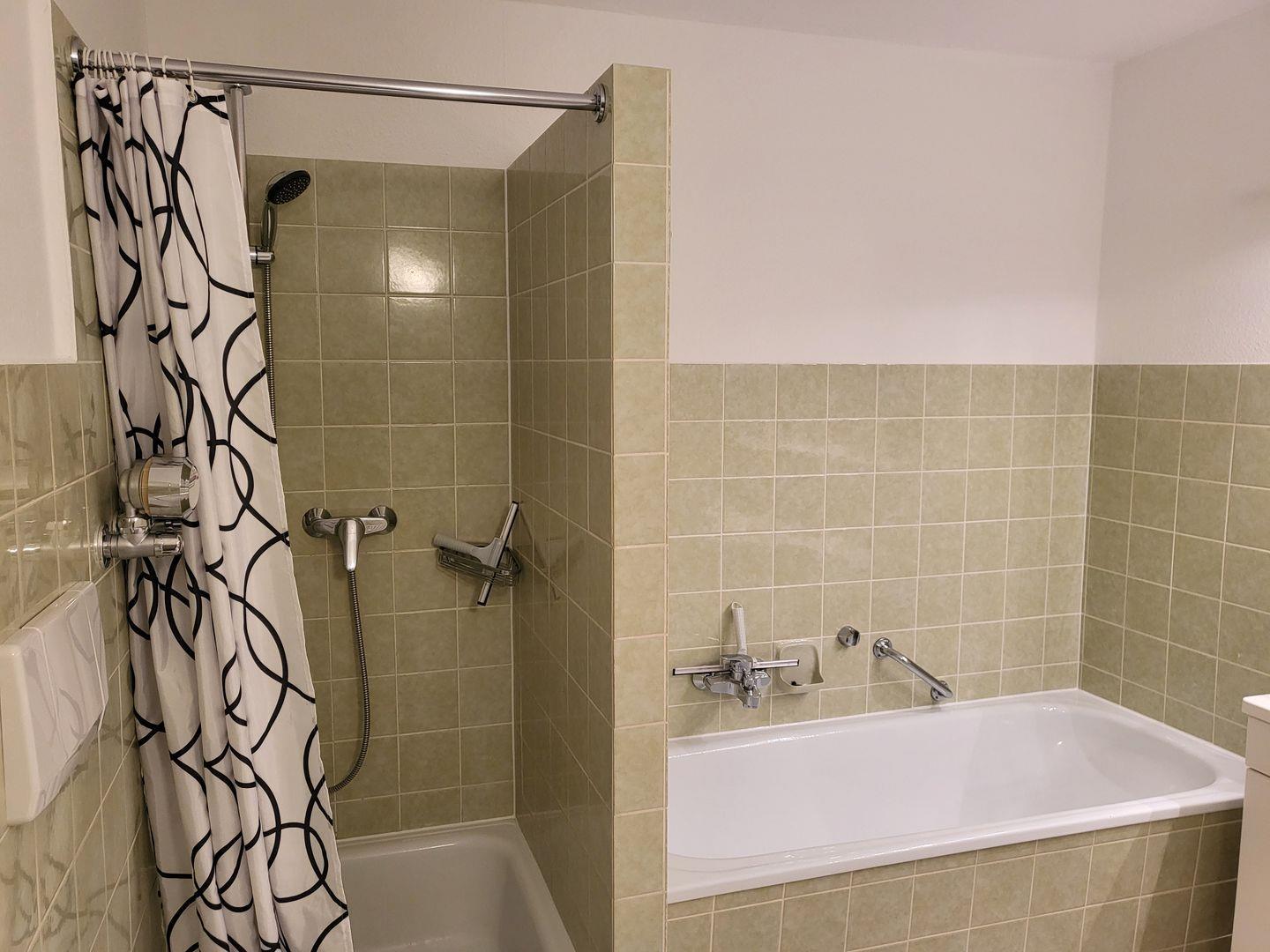 Das großzügige Badezimmer verfügt über eine riesige Spiegelfront mit Ablage sowie Dusche, Badewanne, Föhn und Waschmaschine.